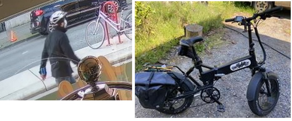 He is described as an adult Caucasian man wearing a black coat, blue jeans, light brown shoes, and a bike helmet. He was last seen riding the e-bike on Pandora Avenue.