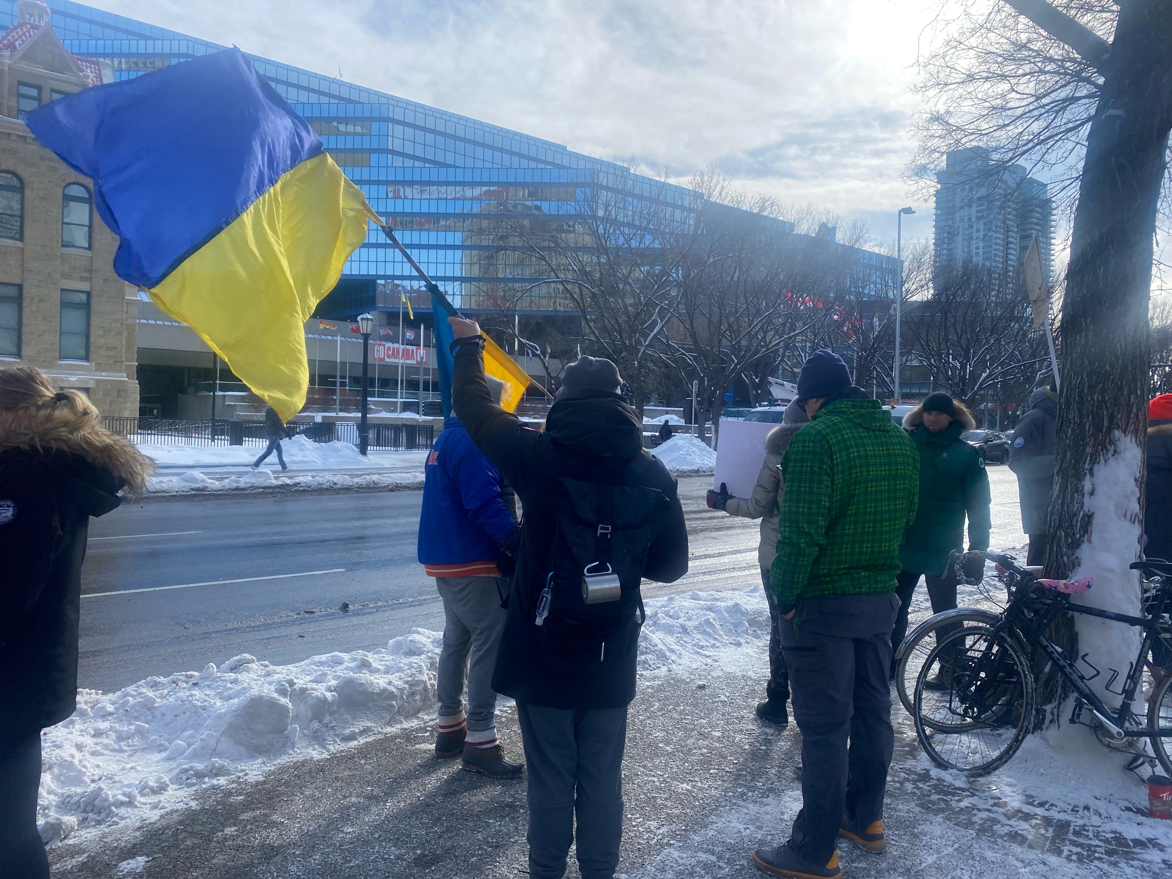 Members of Calgary’s Ukrainian community gathered at city hall over the noon hour on Thursday.
