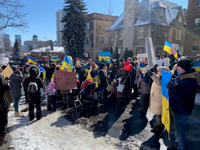 Hundreds of people demonstrated in the square in front of the United Nations headquarters in Geneva, carrying signs such “Make Ukraine a member of NATO now” and “Say no to Putin.”