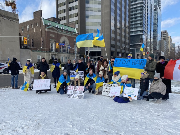 “My family is in Kyiv region and they are attacking Kyiv today. I don’t know what to do, what to think. I am calling them every 10 to 15 minutes,” a protester who gave her name as Victoria said.