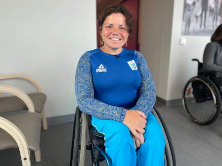In the hallway, she’s approached by another man in a wheelchair, Latvian Paralympic archer Gints Jonasts, who hands her a bunch of pink flowers.