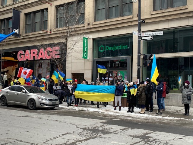 Demonstrators on Sunday ended their protest on union and Ste. Catherine with a Ukrainian prayer.