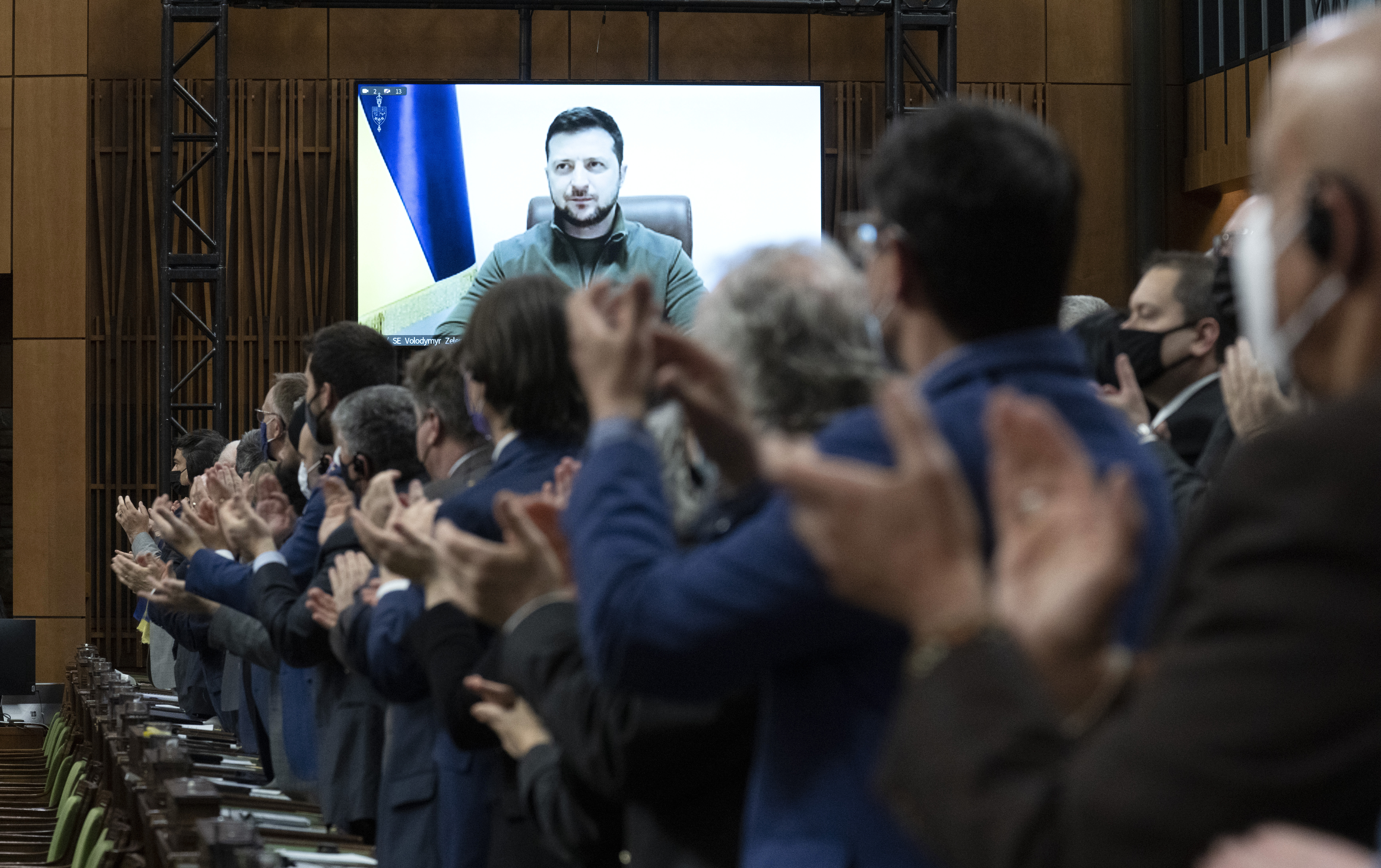 Zelenskyy’s virtual address began with an impassioned plea for Canadians to put themselves in the shoes of Ukrainians facing shelling and horrific violence at the hands of Russian President Vladimir Putin.