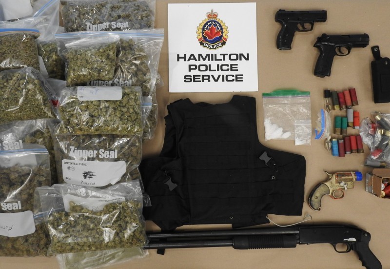 Officers say they say they found marijuana, cocaine and methamphetamine worth $185,000 as well as a shotgun, ammunition, body armour and replica firearms.