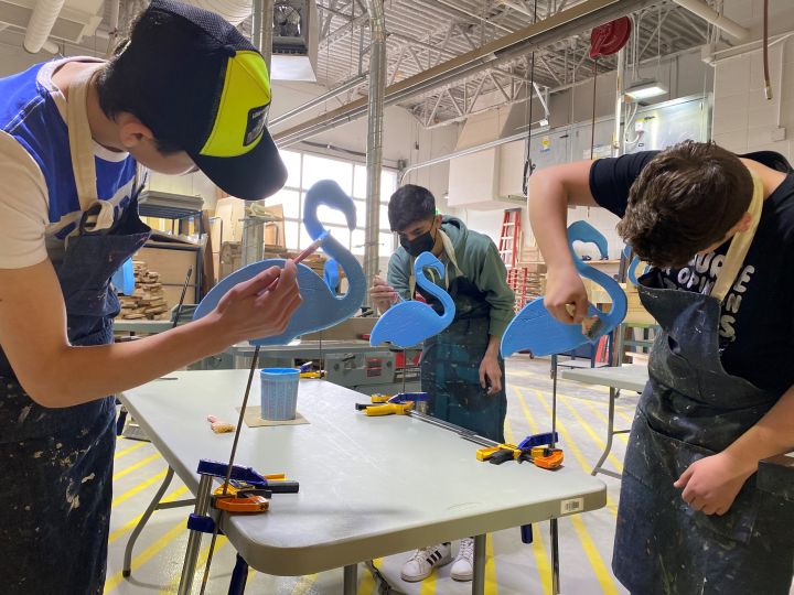 The refugees are among students working in the wood shop at Forest Lawn High School, making wooden flamingos destined for the Sunshine Village Ski Resort, just outside Banff, Alta.