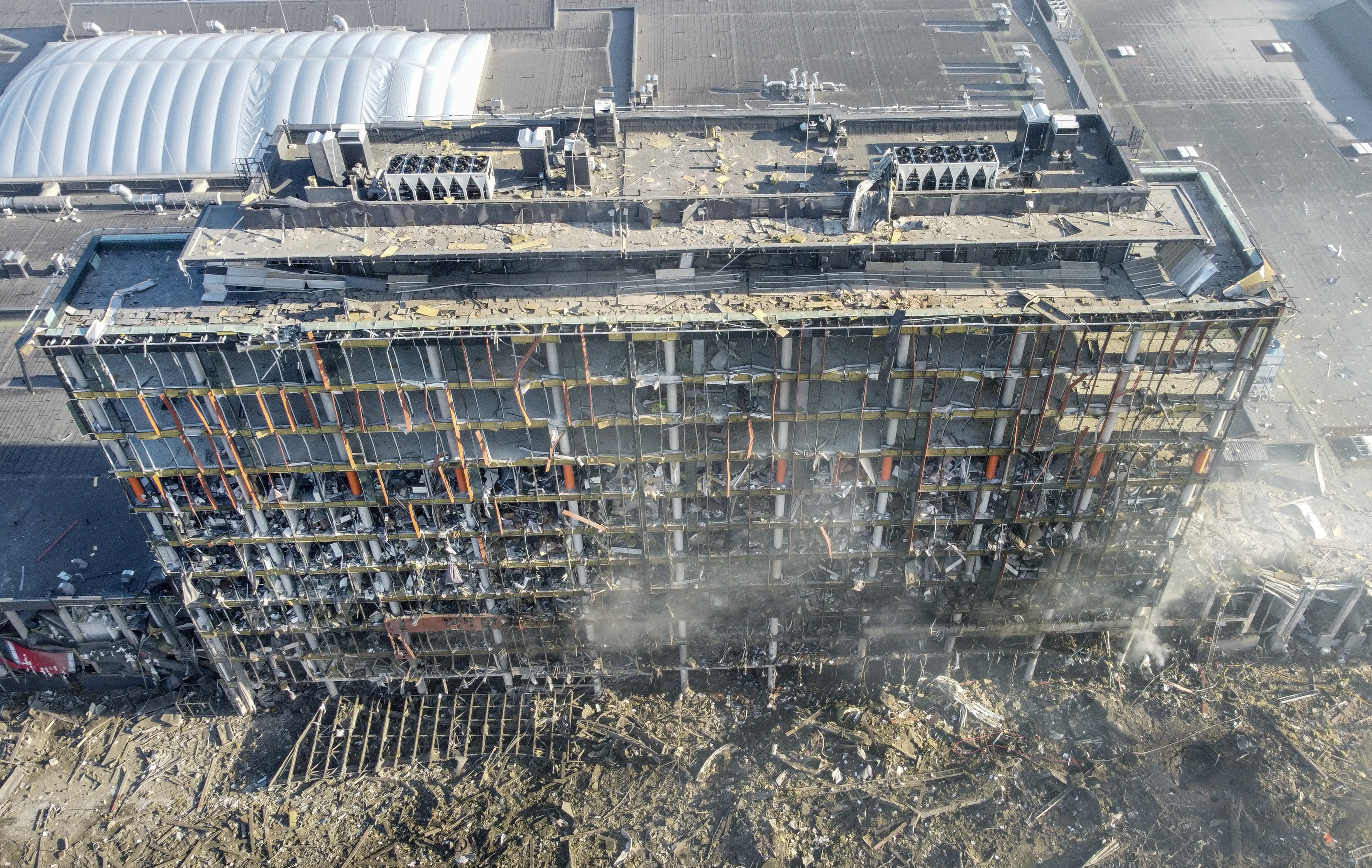 As day broke on Monday, firefighters were putting out small blazes around the smoldering carcass of a building in the shopping centre car park in the Podil district of the city and looking for possible survivors.