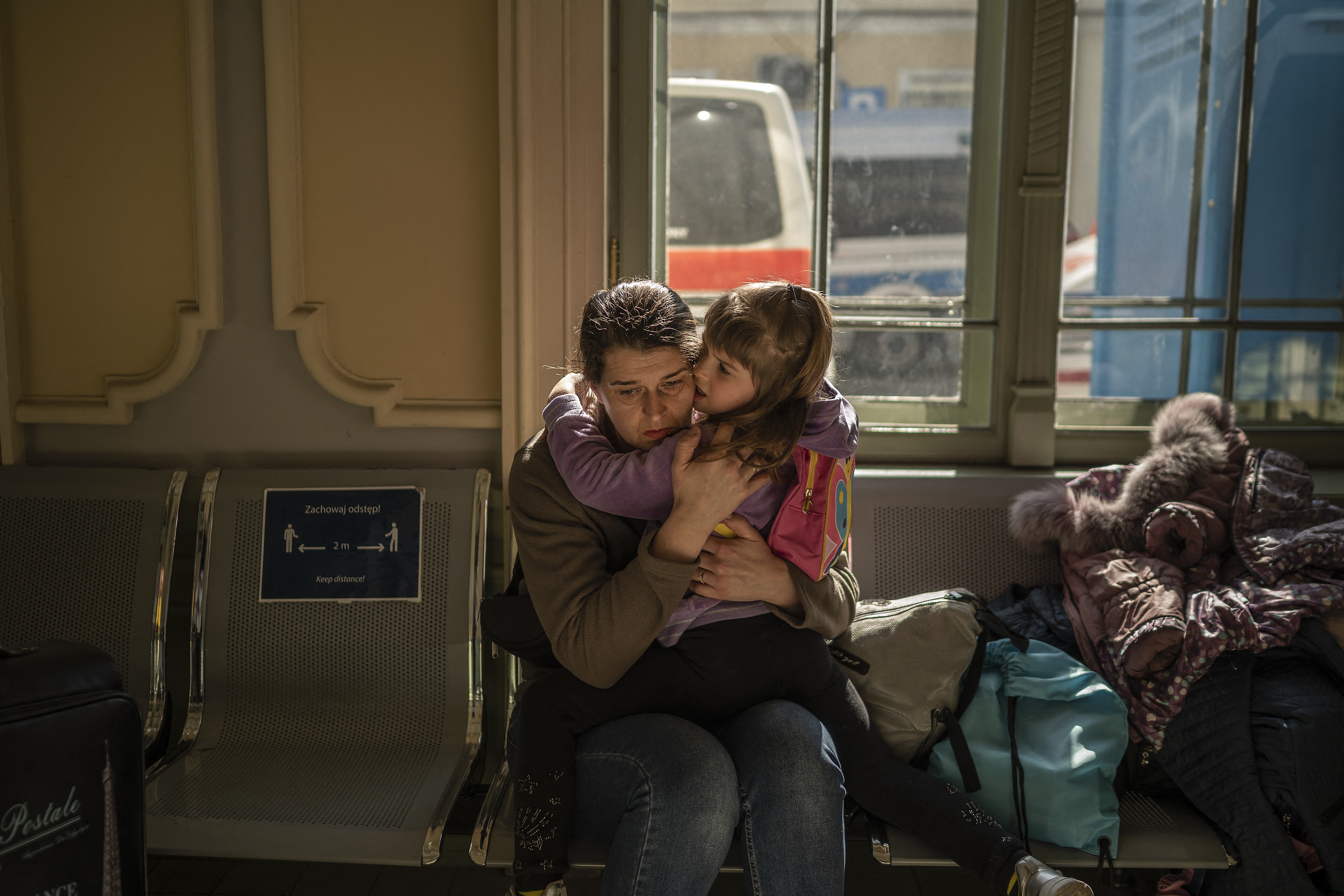 A Ukrainian evacuee hugs a child in the train station in Przemysl, near the Polish-Ukrainian border, on March 22, 2022, following Russia's military invasion launched on Ukraine. ANGELOS TZORTZINIS/AFP via Getty Images