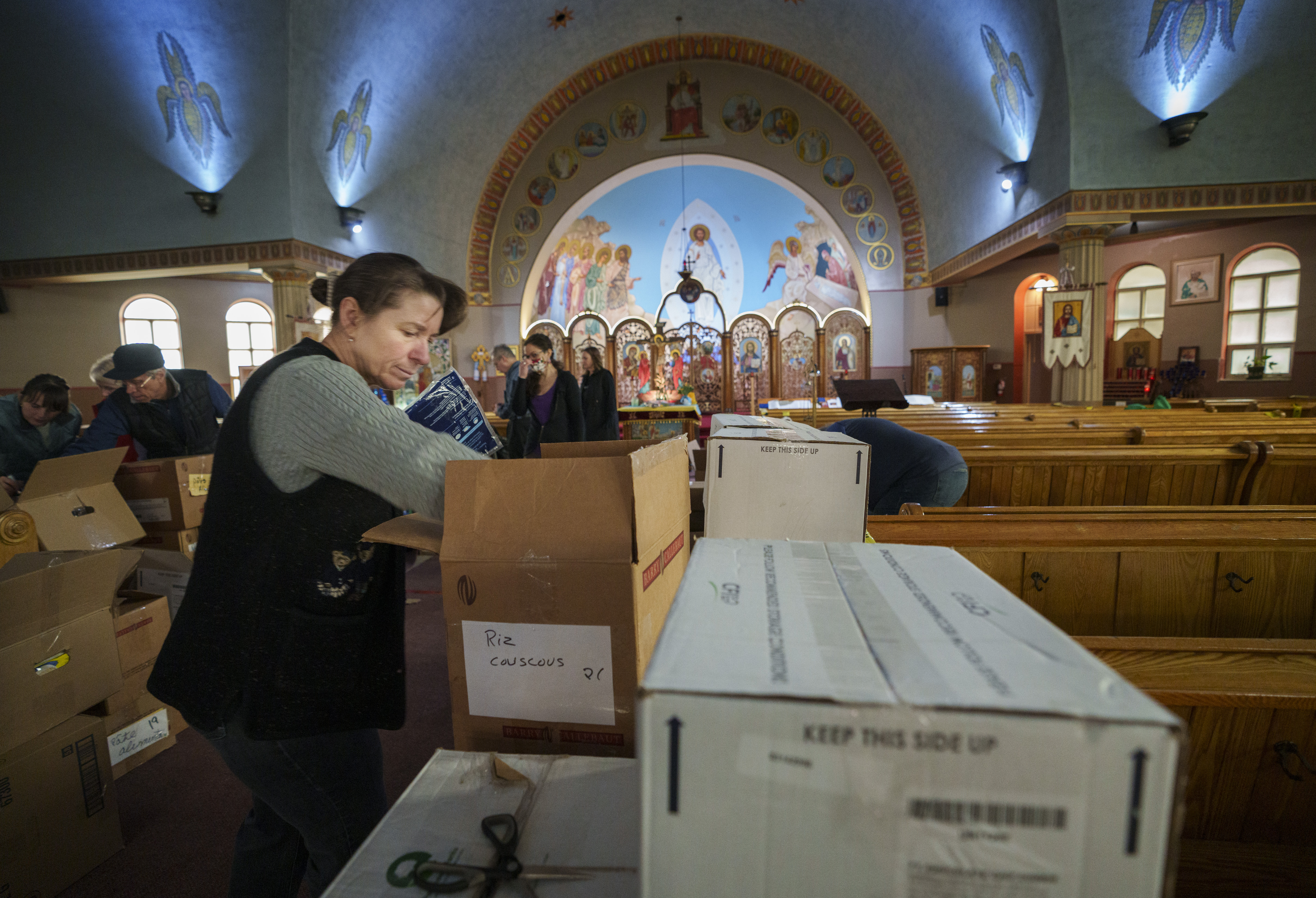 Next to him, in the church nave, pews were packed with cases of non-perishable food, diapers, baby formula, pull-ups and women’s hygiene products. All that stock was in addition to a warehouse full of donations near Montreal’s Trudeau Airport where nearly 100 pallets of goods were stored.