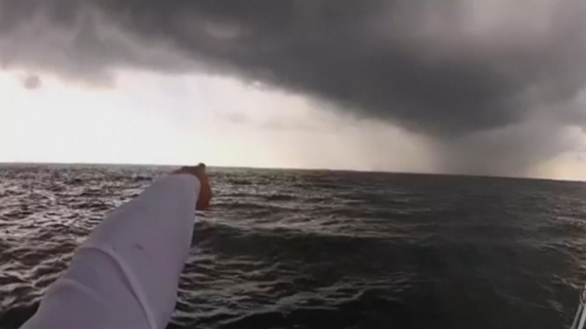 At one point they decided to go into one of the waterspouts, causing torrents of water to hit the camera lens. Waterspouts are very common in the Gulf waters off the Florida coastline.