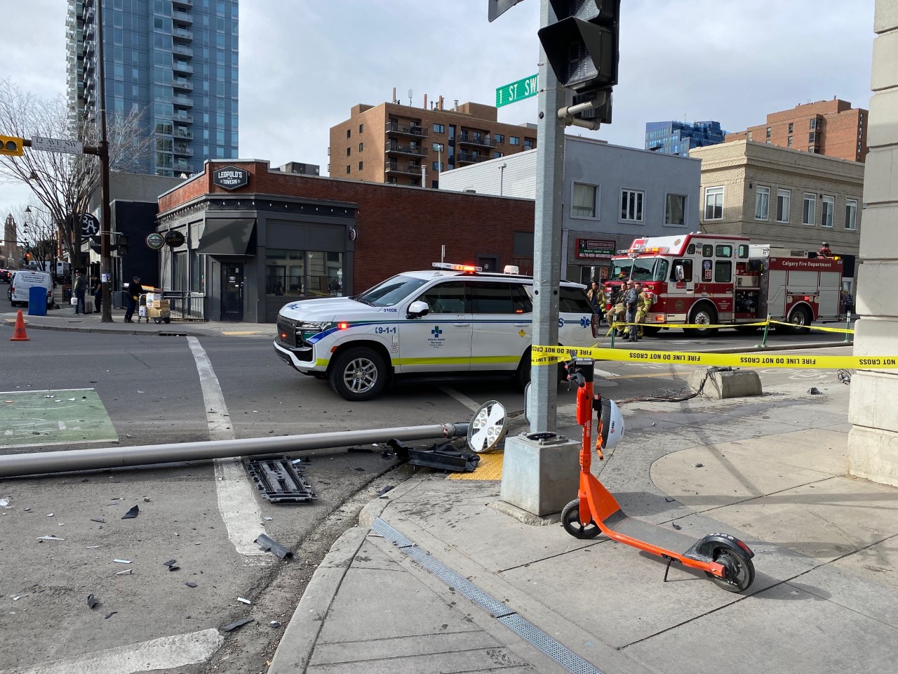 According to the Calgary Police Service, the U-Haul truck drove up onto the sidewalk, struck the pedestrian and a pole, knocking over the pole. Enmax was also on scene.