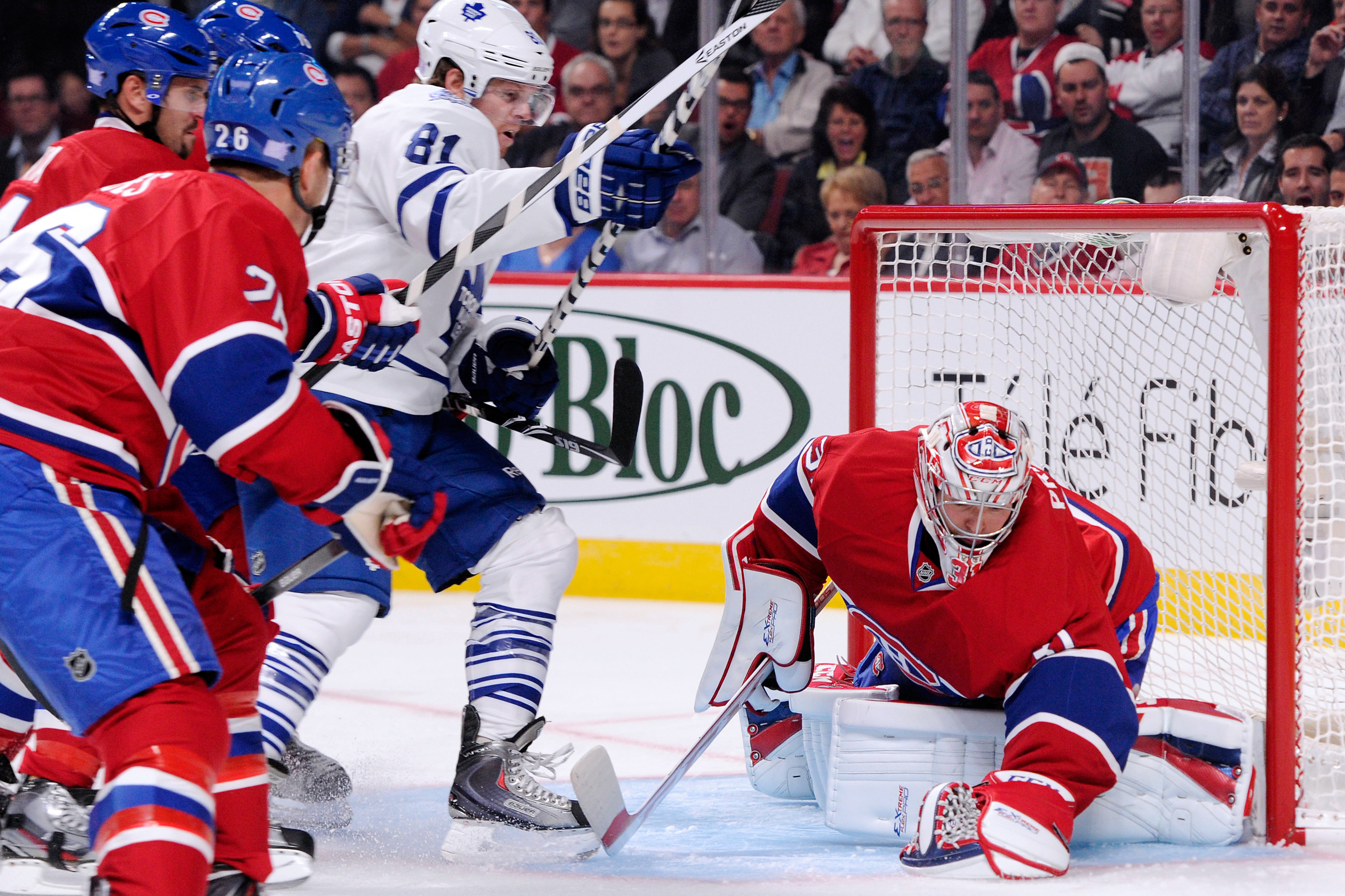 James van Riemsdyk and Dion Phaneuf also scored in a fight-filled contest that saw Montreal’s new enforcer George Parros carried off on a stretcher after Colton Orr pulled him down during a scrap, crashing the Canadiens forward’s face into the Bell Centre ice.