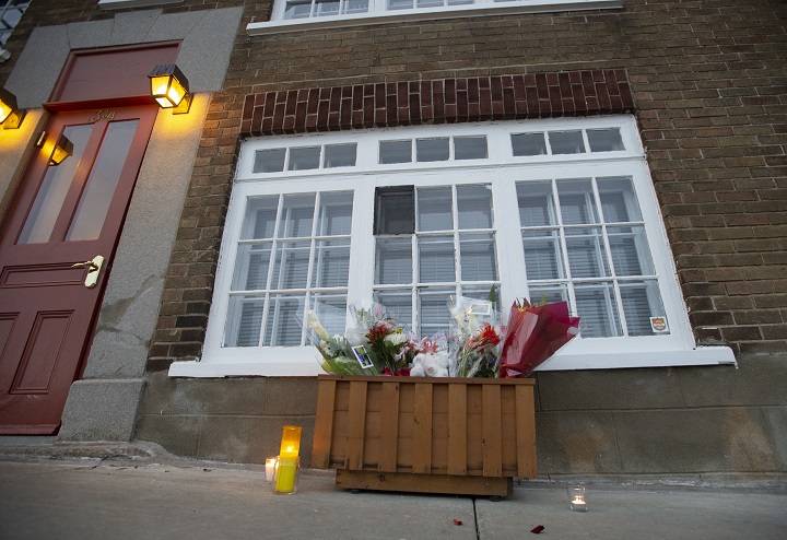 A box of flowers and candles sit in front of Suzanne Clermont's house in Quebec City, Sunday, Nov. 1, 2020. Jacques Boissinot/The Canadian Press