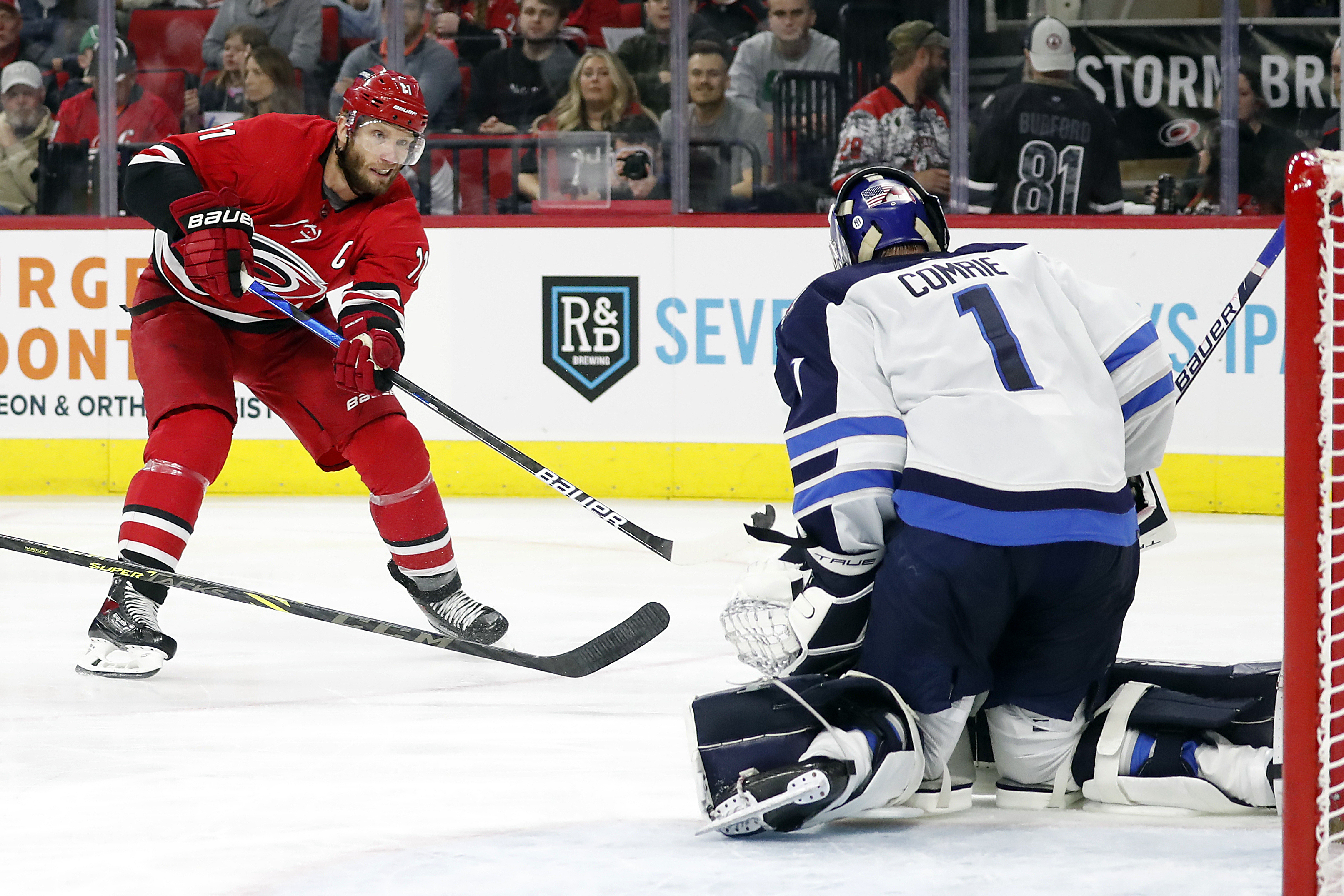 Carolina would amp up the pressure in the latter half of the period, thanks in large part to a pair of power plays but Comrie, making his second straight start in goal, stood his ground, stopping all 17 shots he faced in the first.