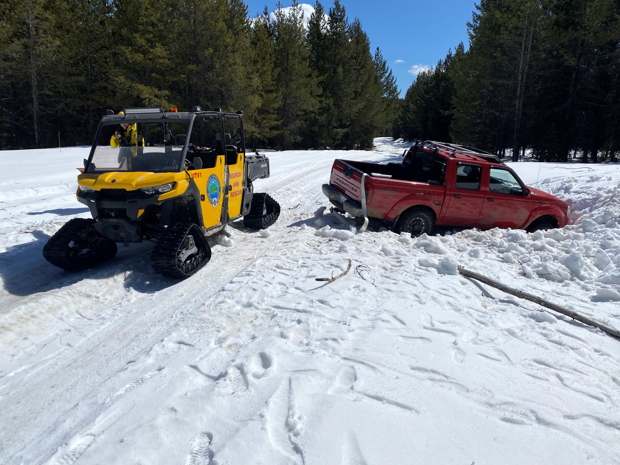 “The UTV team reached the stuck vehicle at 11:44 a.m., but could not locate the subjects,” said COSAR. “However they were able to track them through the snow and made contact shortly afterwards.