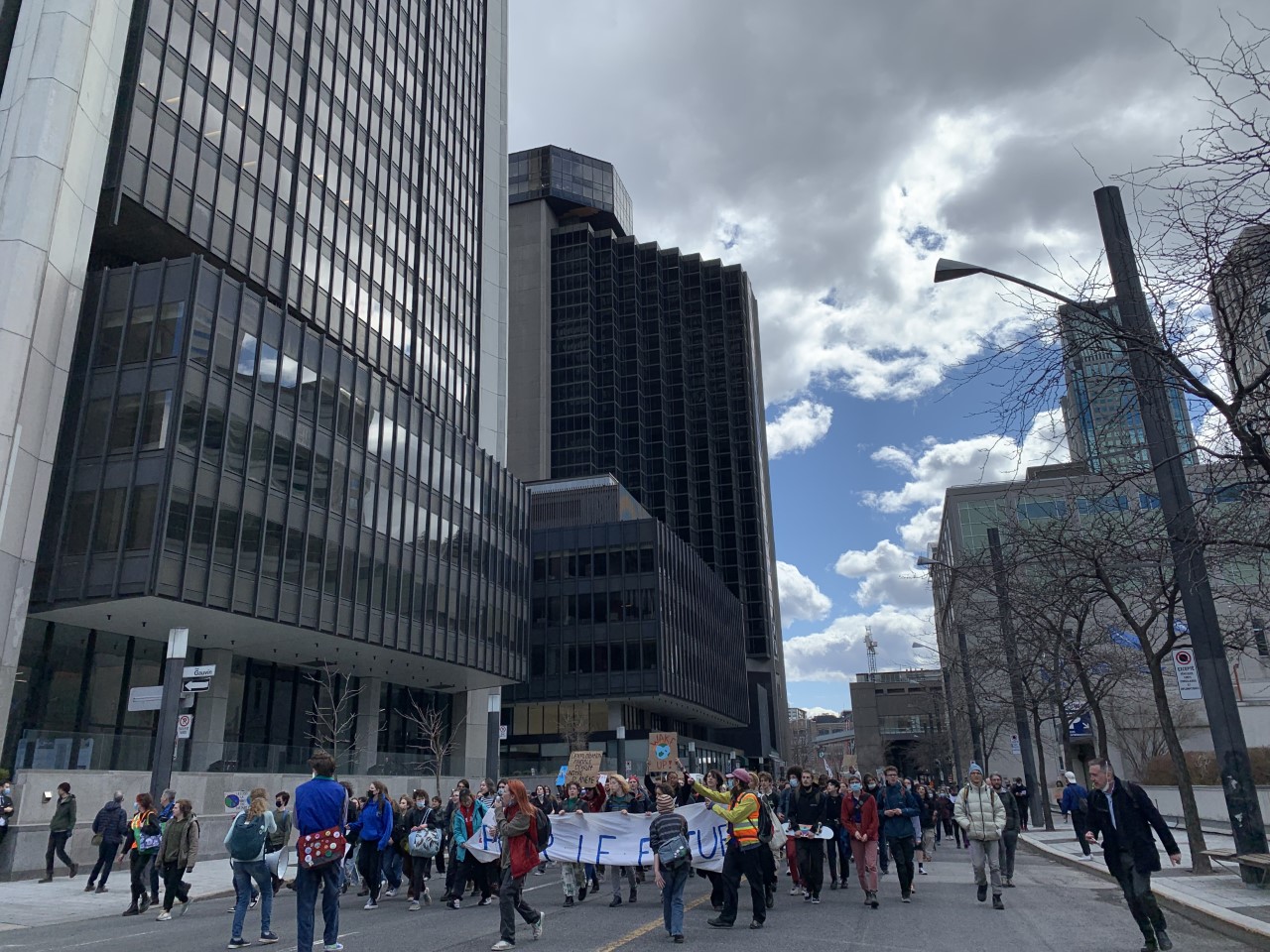 People gathered at Montreal city hall and walked towards Square Victoria in the Old Port.