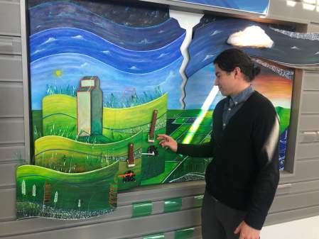 The artwork, which displays a sweeping prairie vista complete with lifelike skies and a lone grain elevator standing tall against the sun, was made in part from recycled wood and plastic water bottles.