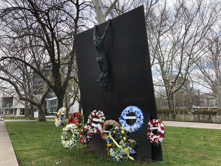 Wreaths laid upon the National Day of Mourning monument located at Main Street West and Bay Street in Hamilton Ont. in 2020. Lisa Polewski/Global News