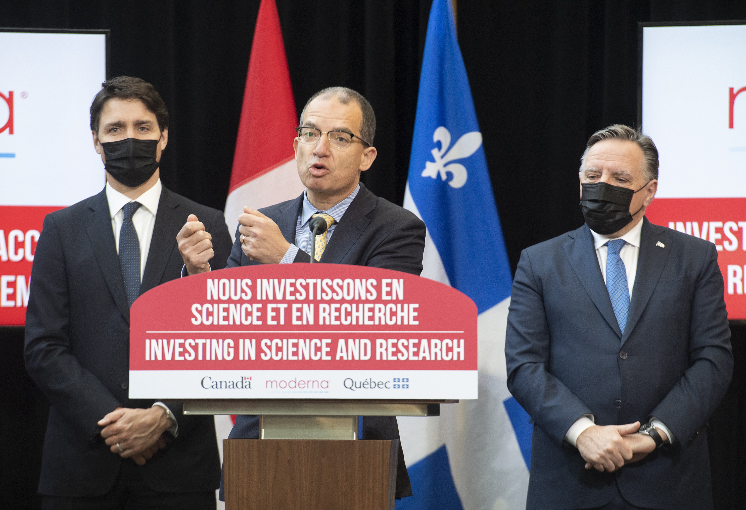 Prime Minister Justin Trudeau and Quebec Premier François Legault were alongside Moderna CEO Stéphane Bancel for the announcement in the city.