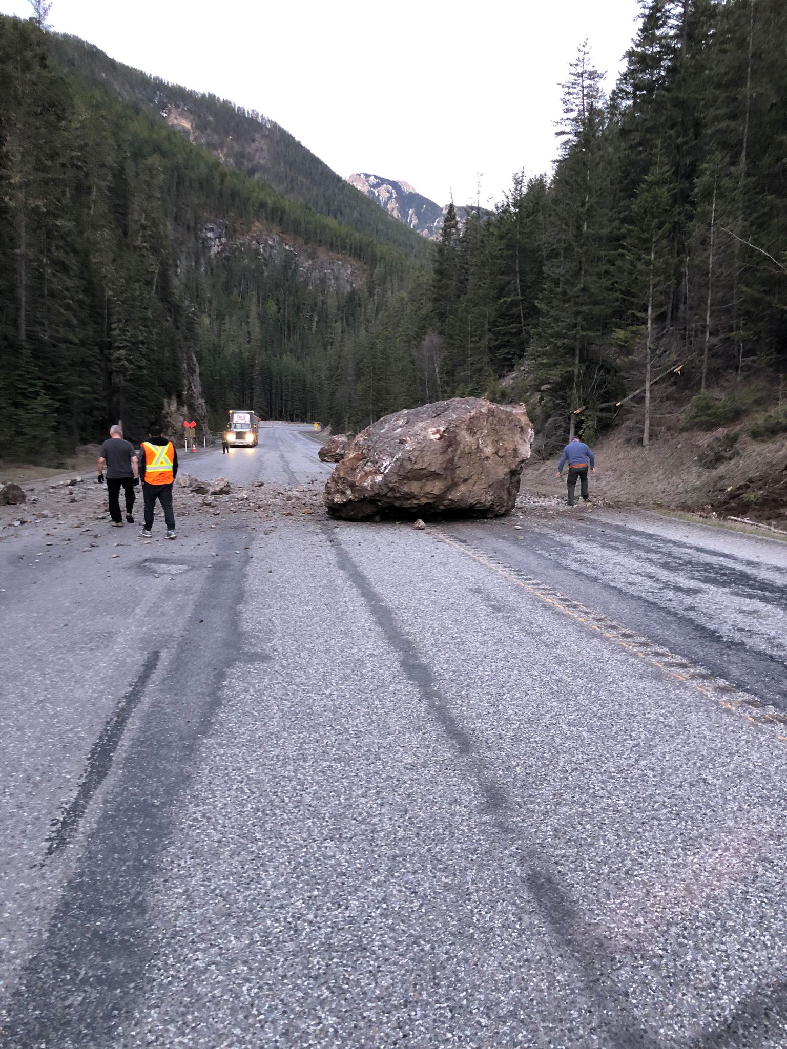A boulder rolled onto the middle of the highway, about seven kilometres north of Radium Hot Springs, according to Kootenay National Park’s social media.