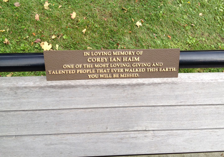 A nearby bench — a gift from a family friend in Los Angeles — includes a plaque that reads: “In loving memory of Corey Ian Haim. One of the most loving, giving and talented people that ever walked this earth. You will be missed.”