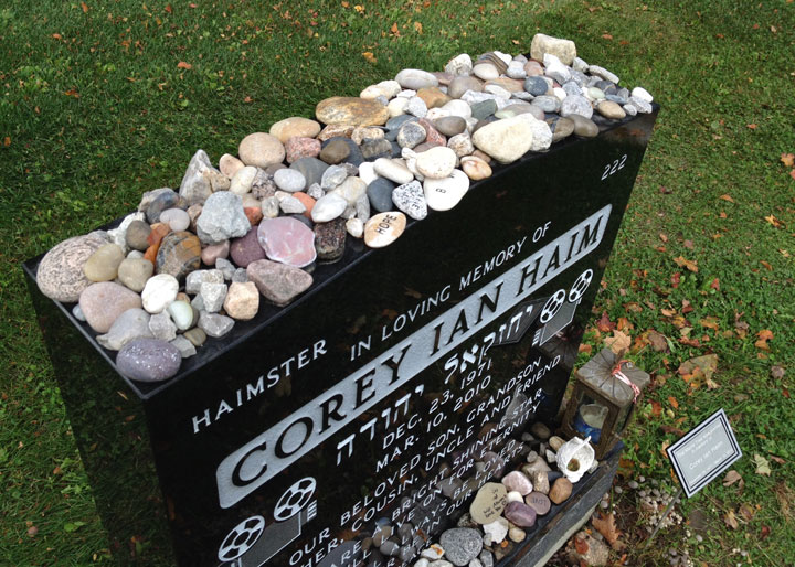 Four stones, placed in a line, spell out “Why u.” One, painted with colourful insects, reads: “R.I.P. Haimster.”