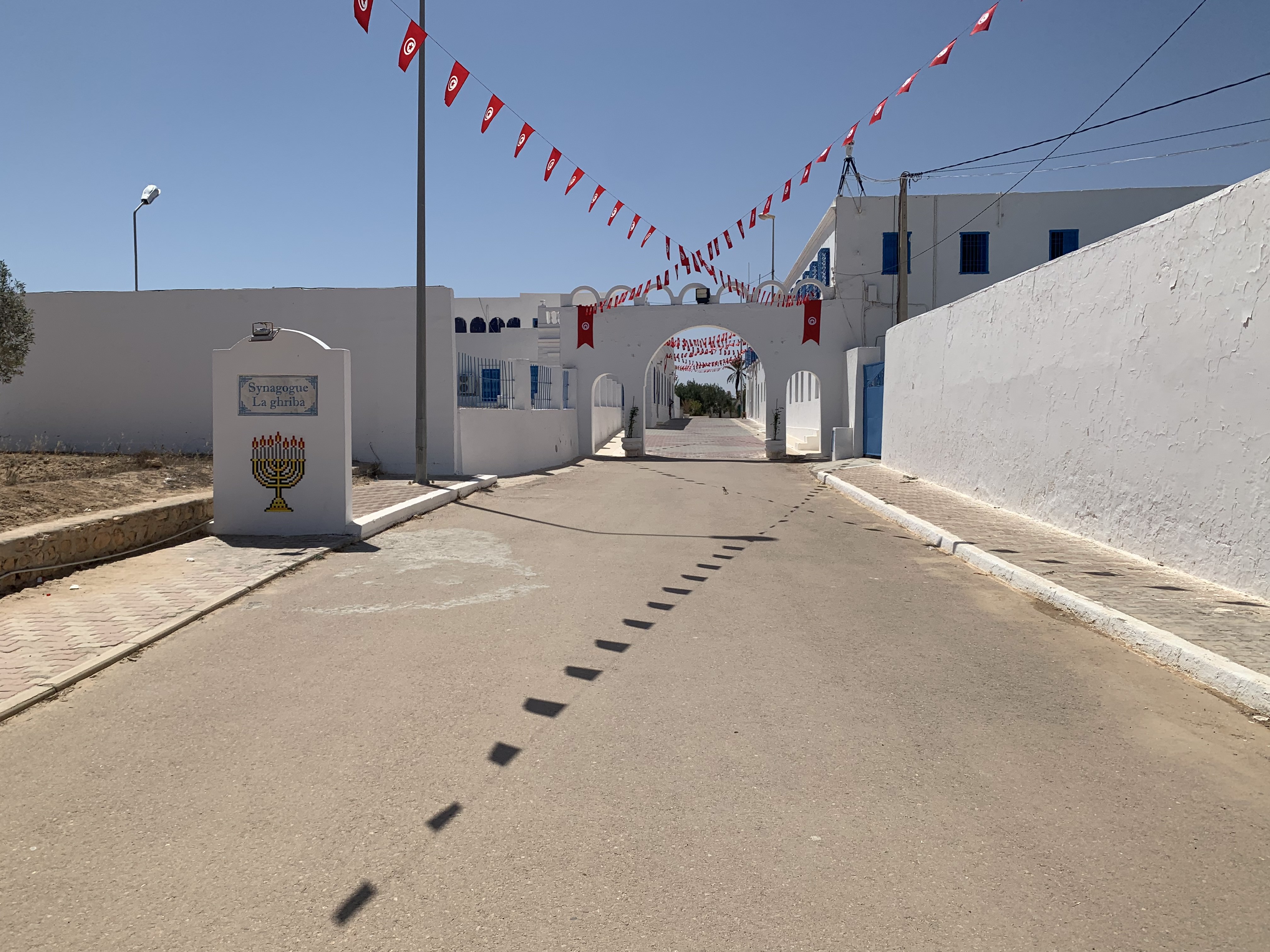 Djerba’s historic El Ghriba synagogue is nestled on a small island off the coast of Tunisia, its entrance adorned with bright red Tunisian flags that guide tourists towards the serene white and blue building.