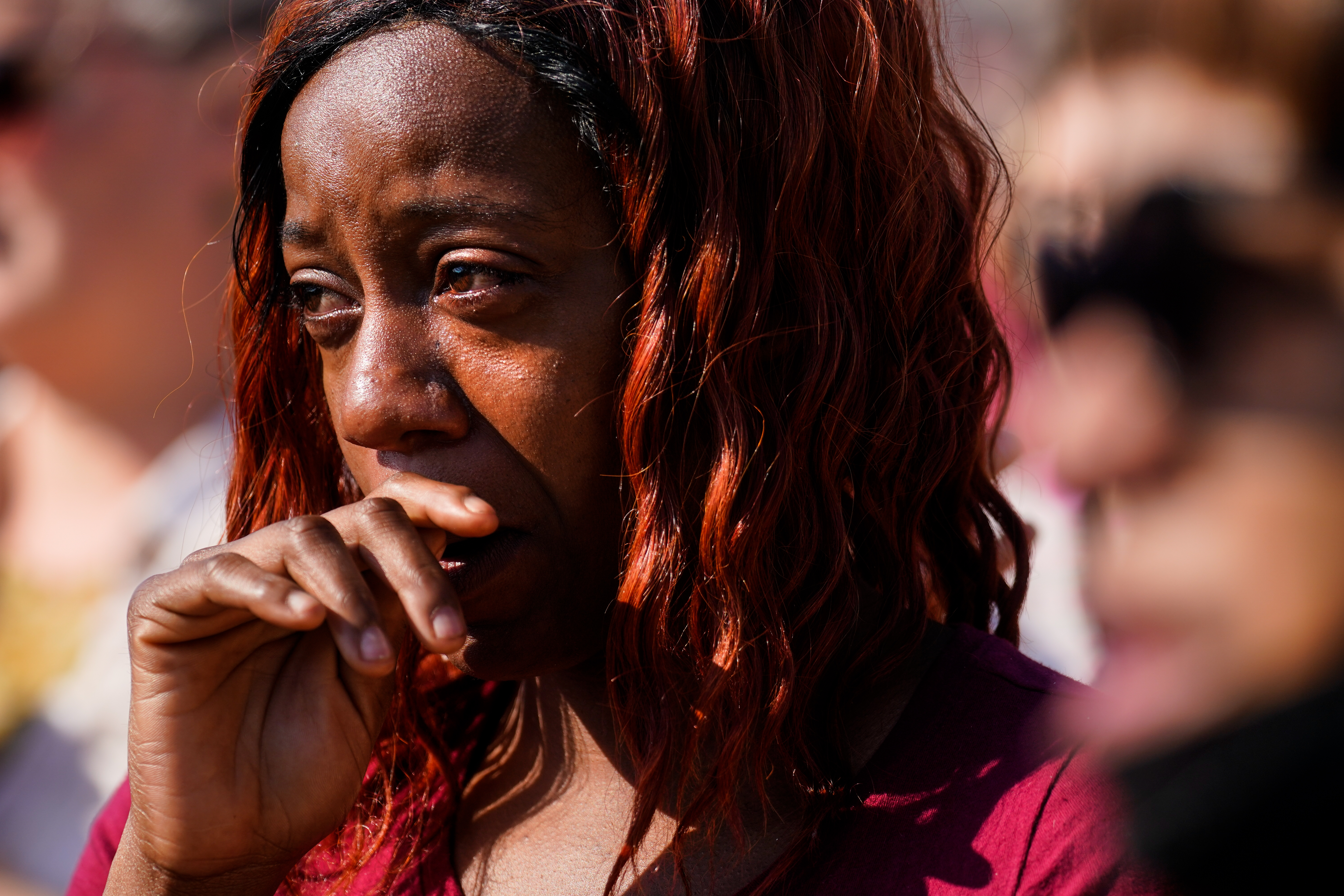 “Somebody knew enough to know the one store our community has,” said Denise Glenn, an activist from VOICE Buffalo, speaking to the clutch of about 100 people who gathered on Sunday morning outside Tops, which had been cordoned off by police tape and adorned with flowers and makeshift memorials.