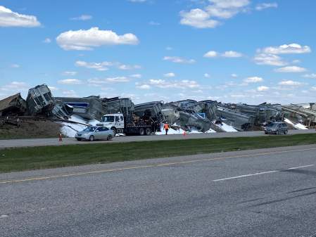 Fort Macleod RCMP said police and fire crews were called to the derailment east of Fort Macleod at 8:15 a.m. Police said it happened along Highway 3 between Range Road 251 and Range Road 252.