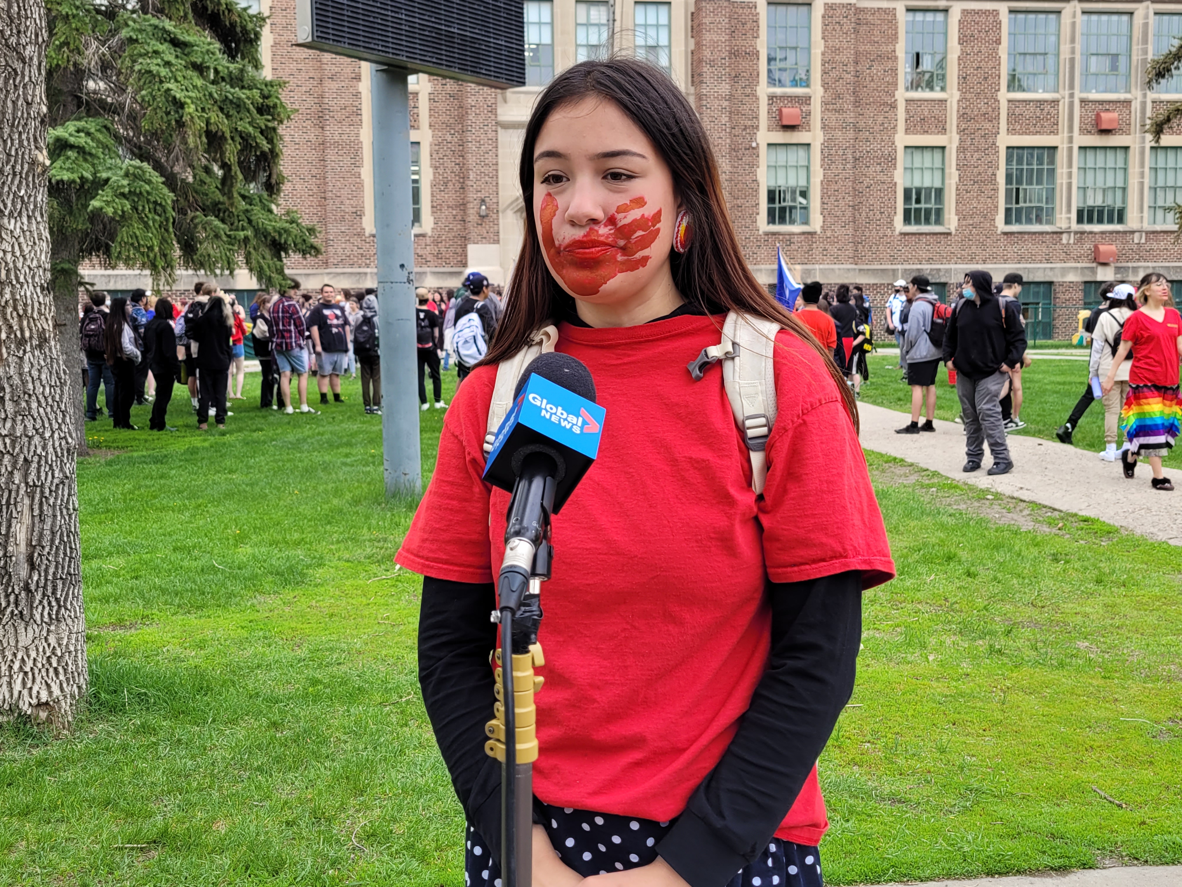 On May 27, 2022, a Grade 12 student along with her peers organized a march where students were carrying signs, chanting ‘we want justice’ with handprints painted on their faces and had worn red shirts to symbolize the color that represents violence against MMIW.