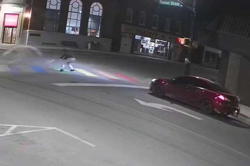 In the video, released by the OPP, a southbound dark red-coloured sedan can be seen at the intersection, waiting for two oncoming vehicles to pass. One person can then be seen exiting the vehicle and throwing the paint across the roadway before getting back into the car which then drives away.