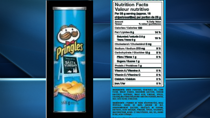 OTTAWA – Pringles brand salt and vinegar potato chips are being recalled because they contain milk that isn’t declared on the label.