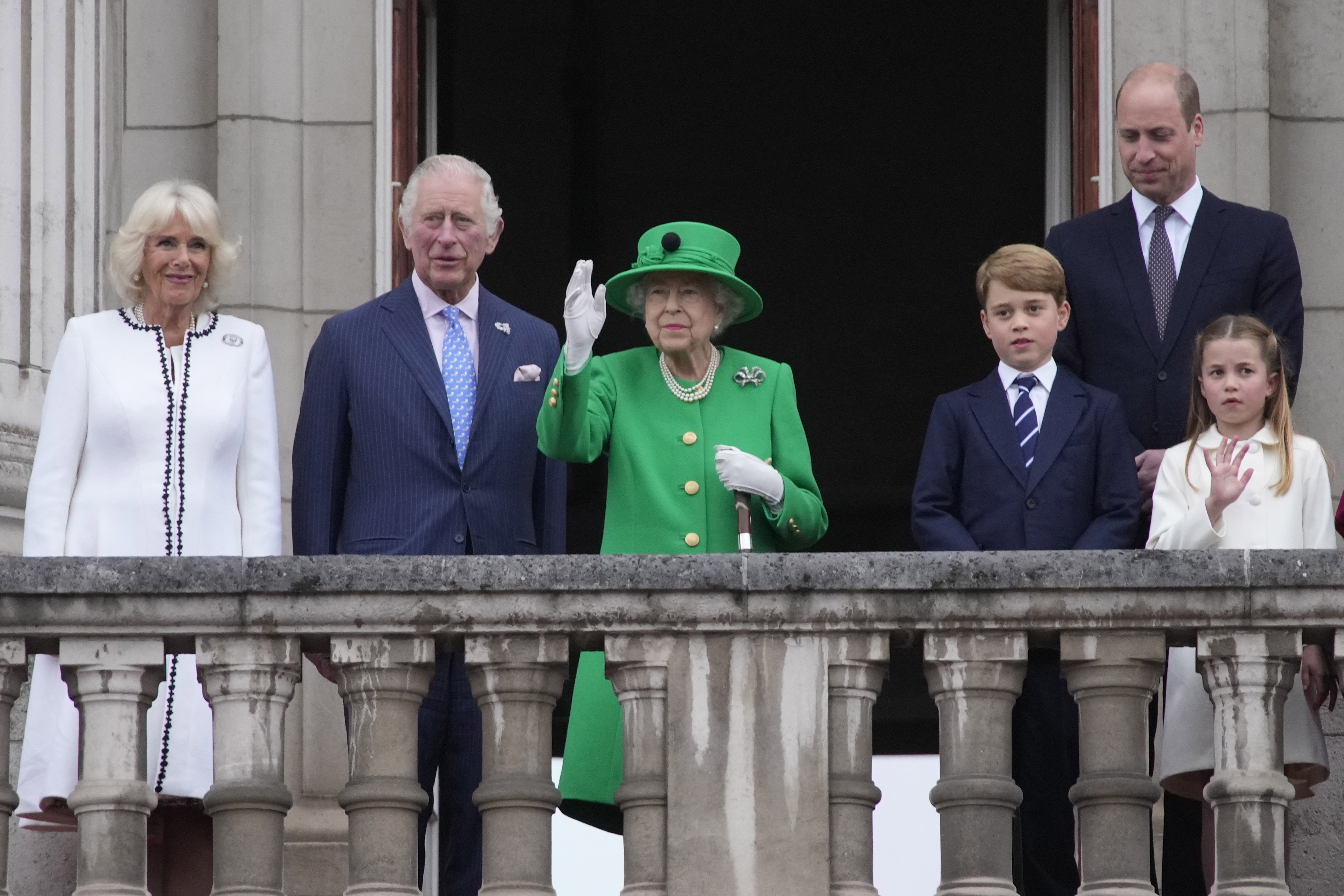 Thousands massed outside Buckingham Palace for the climax of a boisterous, colorful pageant cheered as the monarch appeared on the balcony with her son and heir, Prince Charles, his wife Camilla, and her eldest grandson Prince William and his family.