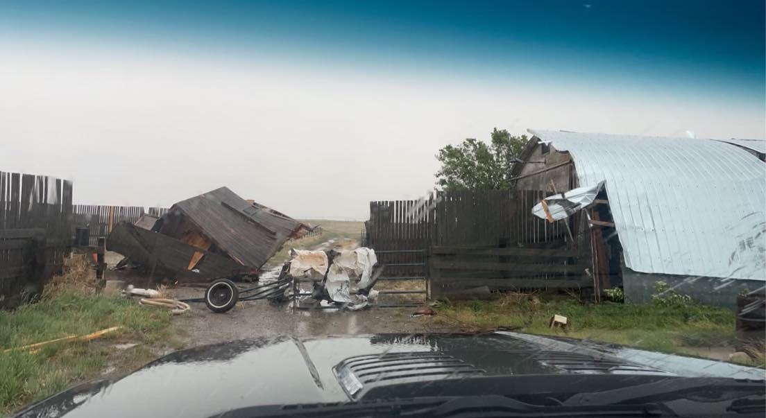 Judy Dunsmore told Global News most of the damage on the family’s property about 10 kilometres east of Enchant was to farm buildings and corrals.