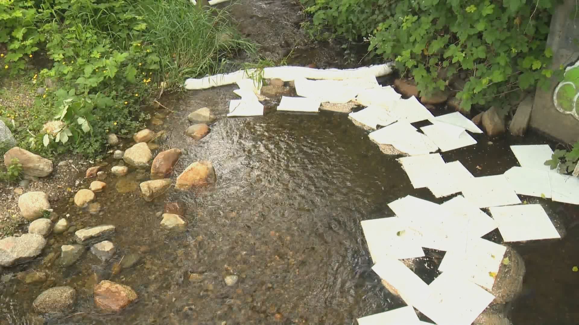 Coquitlam director of utilities Jonathan Helmus said crews put booms and absorbent pads into the creek to soak up the pollutant, and returned on Sunday to replace them. Most of the pollutant was gone, he said.