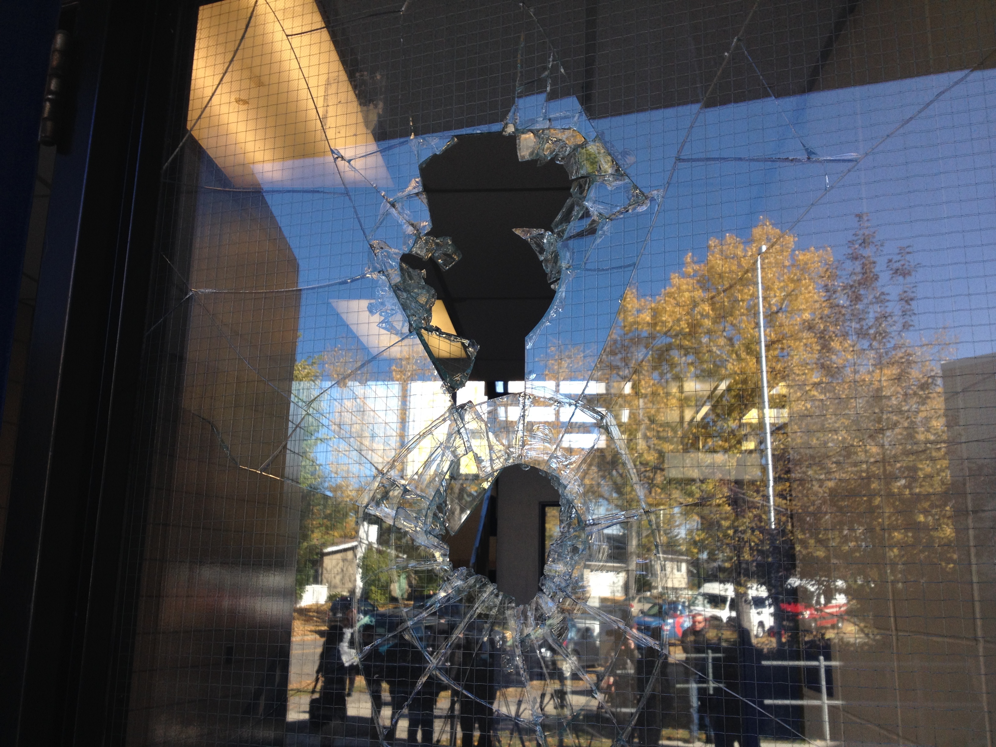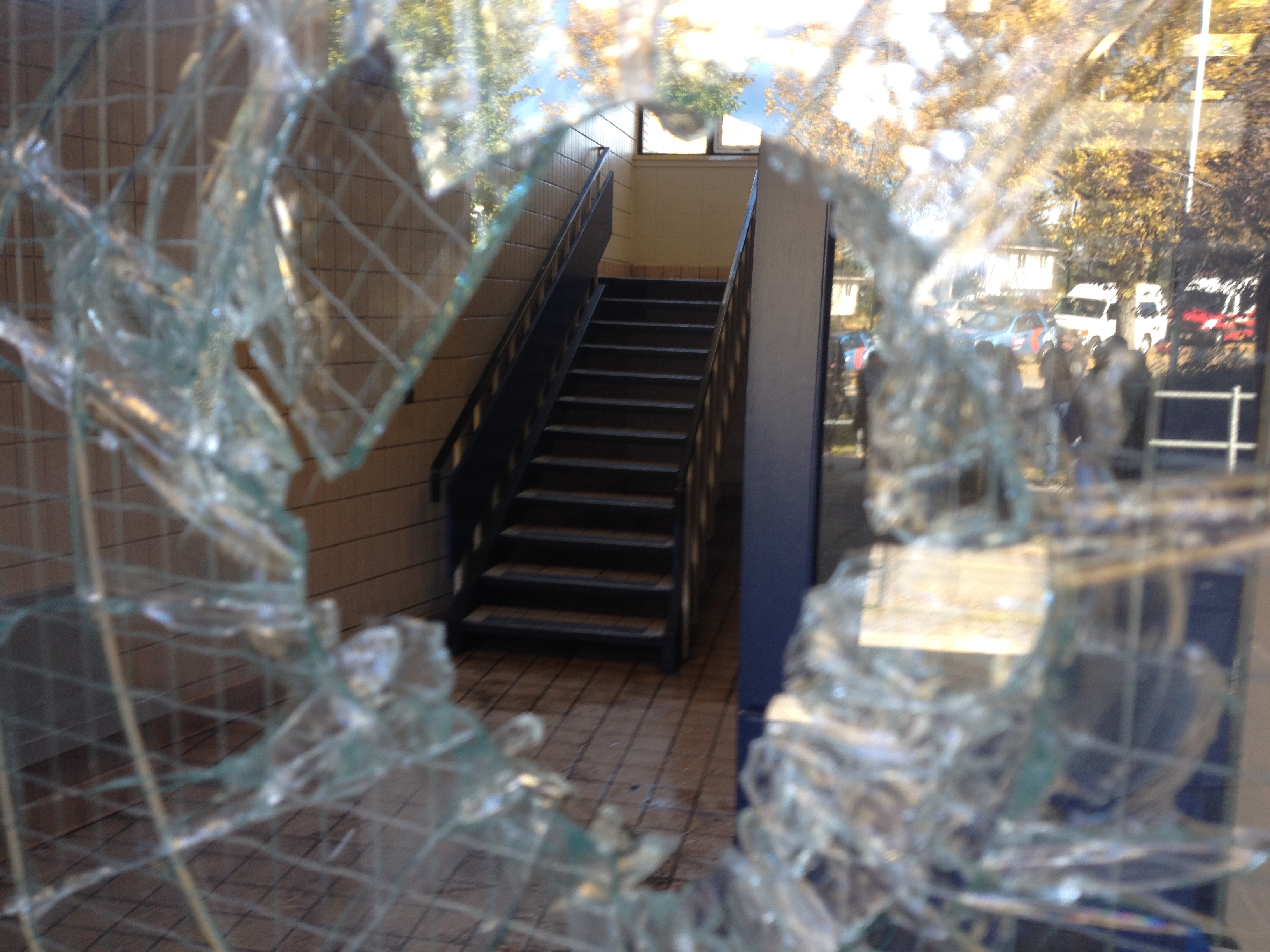 All of the windows on the east side of the school were found broken, potentially by rocks, which were discovered inside the school on the floor.