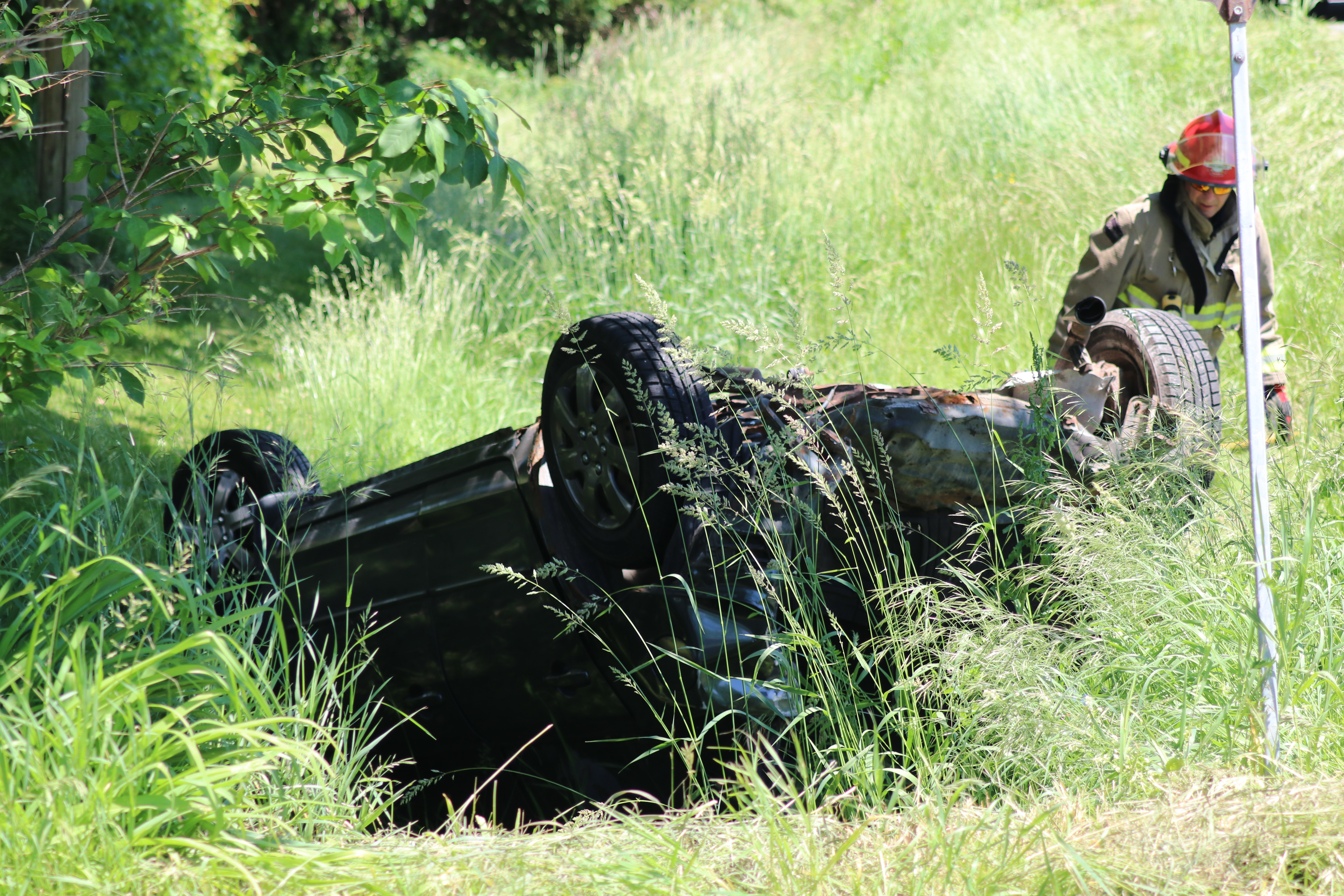 Witness James Clancy says he was driving eastbound when he saw the collision. He said both vehicles were travelling westbound when the sedan slowed to turn into the entrance to the golf club when it was rear-ended by the dump truck. The collision sent the sedan rolling into a ditch.