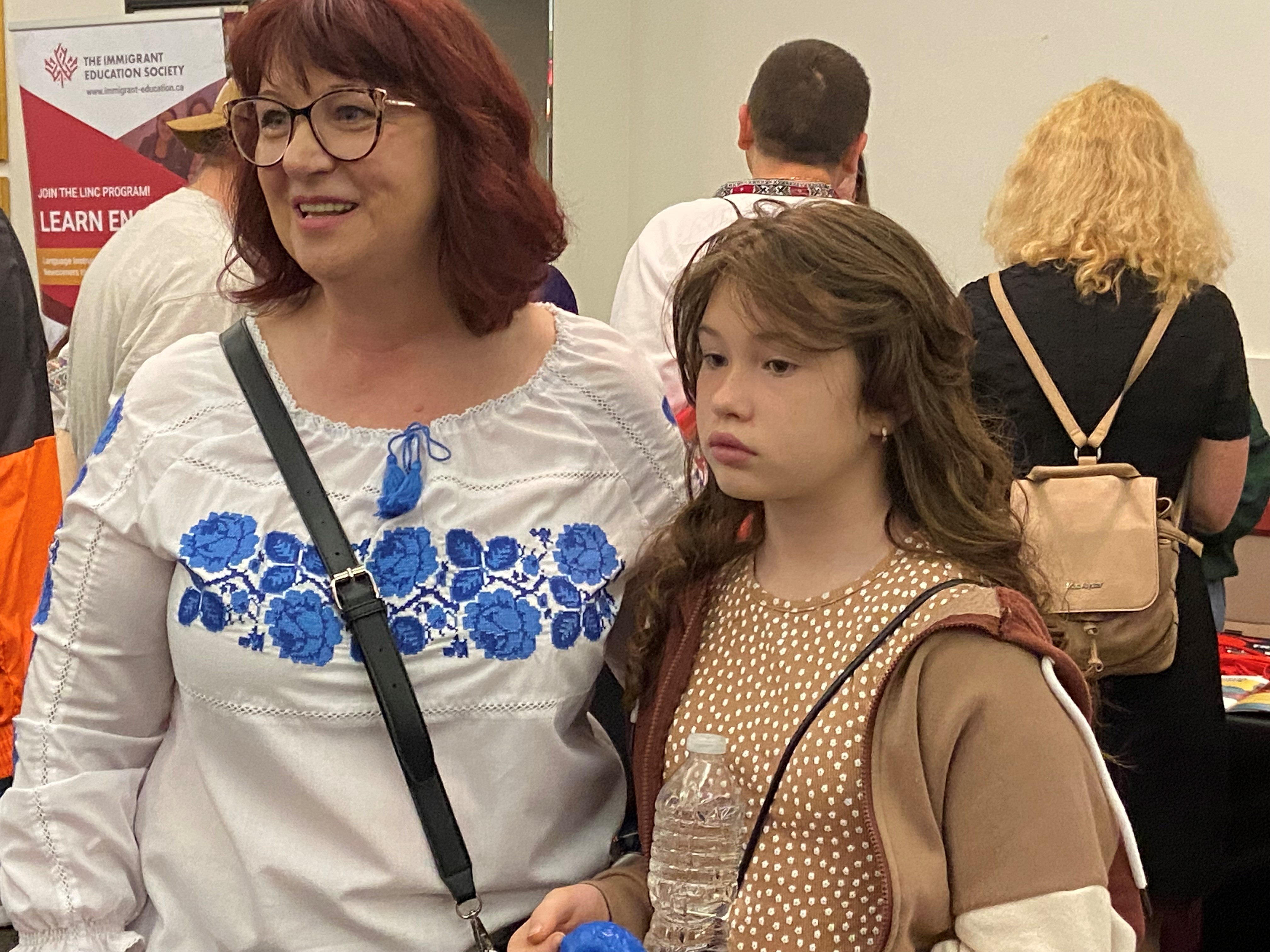 Larysa Taranenko lives in Calgary. She was at the church with her 10-year-old granddaughter Anastasiia. Anastasiia and her 14-year-old brother are now living with her after leaving Ukraine. They arrived here in April along with Taranenko’s daughter. The 10-year-old misses her father who she had to leave behind.
