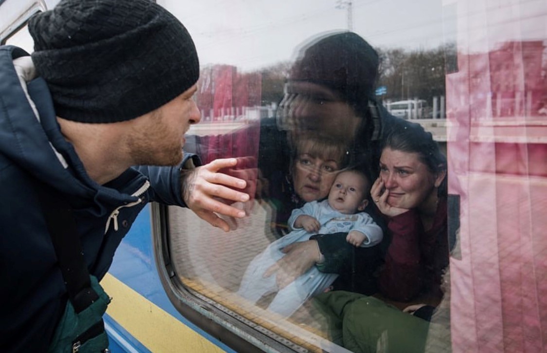 One photograph shows a kneeling soldier kissing a child inside a subway station, where Ukraine families shelter from Russian airstrikes. In another, an infant and a woman who appears on the brink of tears look out from a departing train car as a man peers inside, his hand spread across the window in a gesture of goodbye.