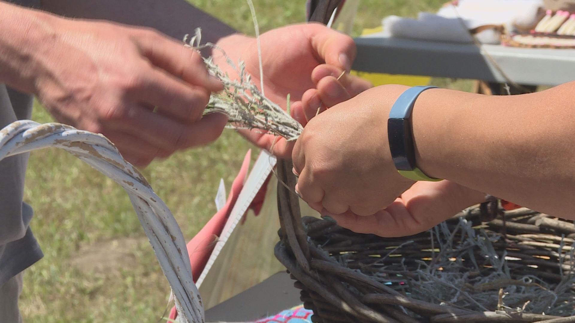 At one booth, volunteer Ashley Tarves was showing community members how to make smudge bundles and prayer bundles using sage, cedar and juniper she harvested herself.