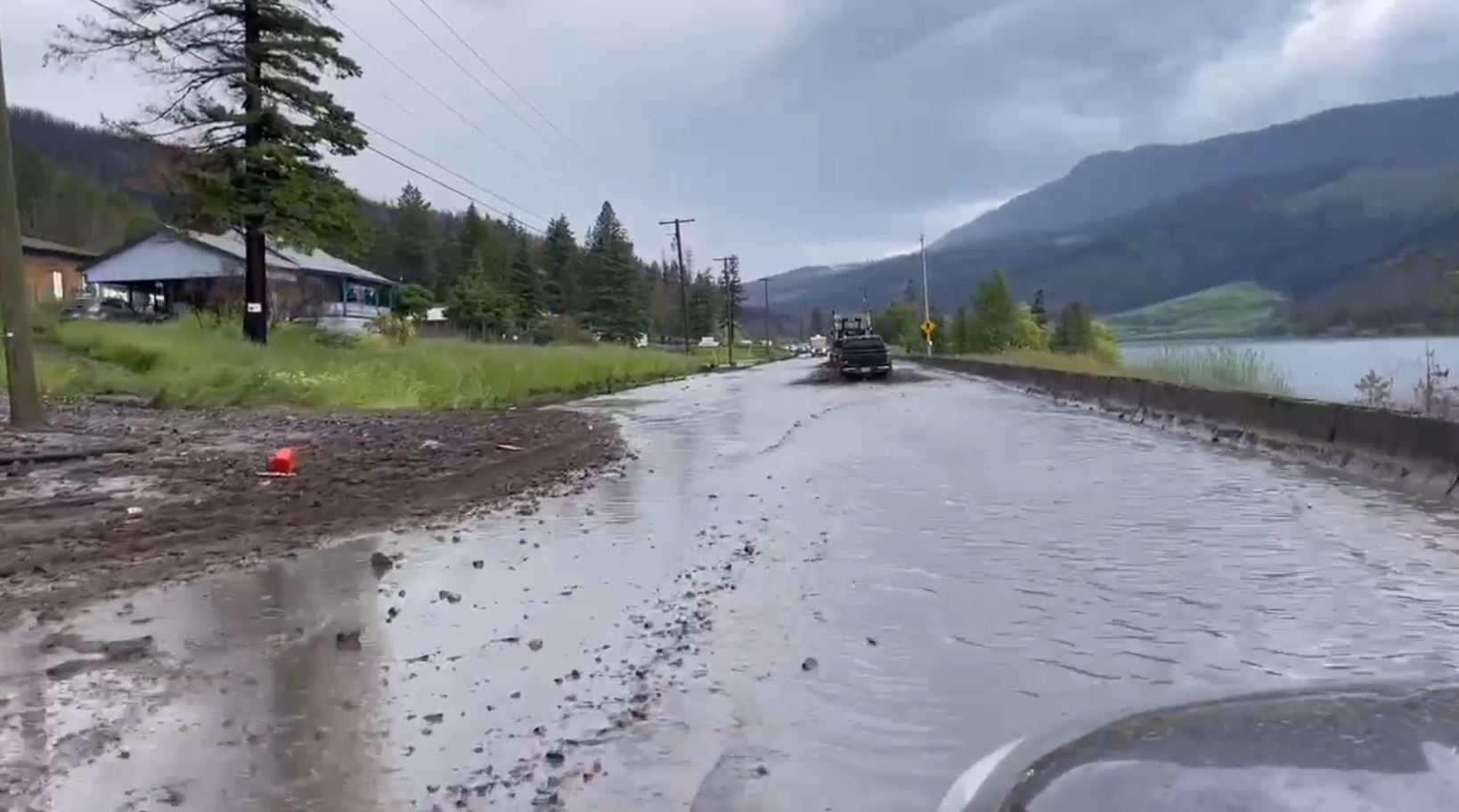 According to DriveBC, water from Tuesday’s rainstorm is pooling between Douglas Lake Road and Barnhartvale Road, a distance of 16.8 kilometres.