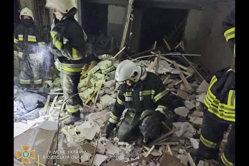 Video of the attack before daybreak showed the charred ruins of buildings in the small town of Serhiivka, about 50 kilometers (31 miles) from Odesa. The Ukrainian president’s office said warplanes fired three missiles that struck an apartment building and a campsite.