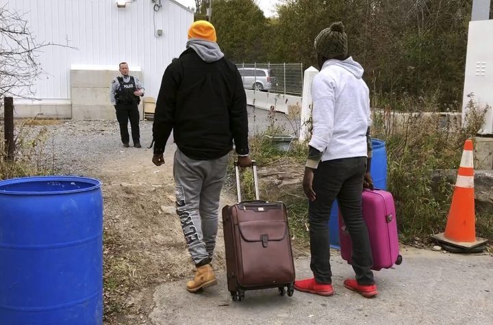 In this Nov. 4, 2019, photo, two men from Nigeria cross the U.S. border at Roxham Road in Champlain, N.Y., into Canada where Royal Canadian Mounted Police stand, rear, in Saint-Bernard-de-Lacolle, Quebec. (AP Photo/Wilson Ring). (AP Photo/Wilson Ring)