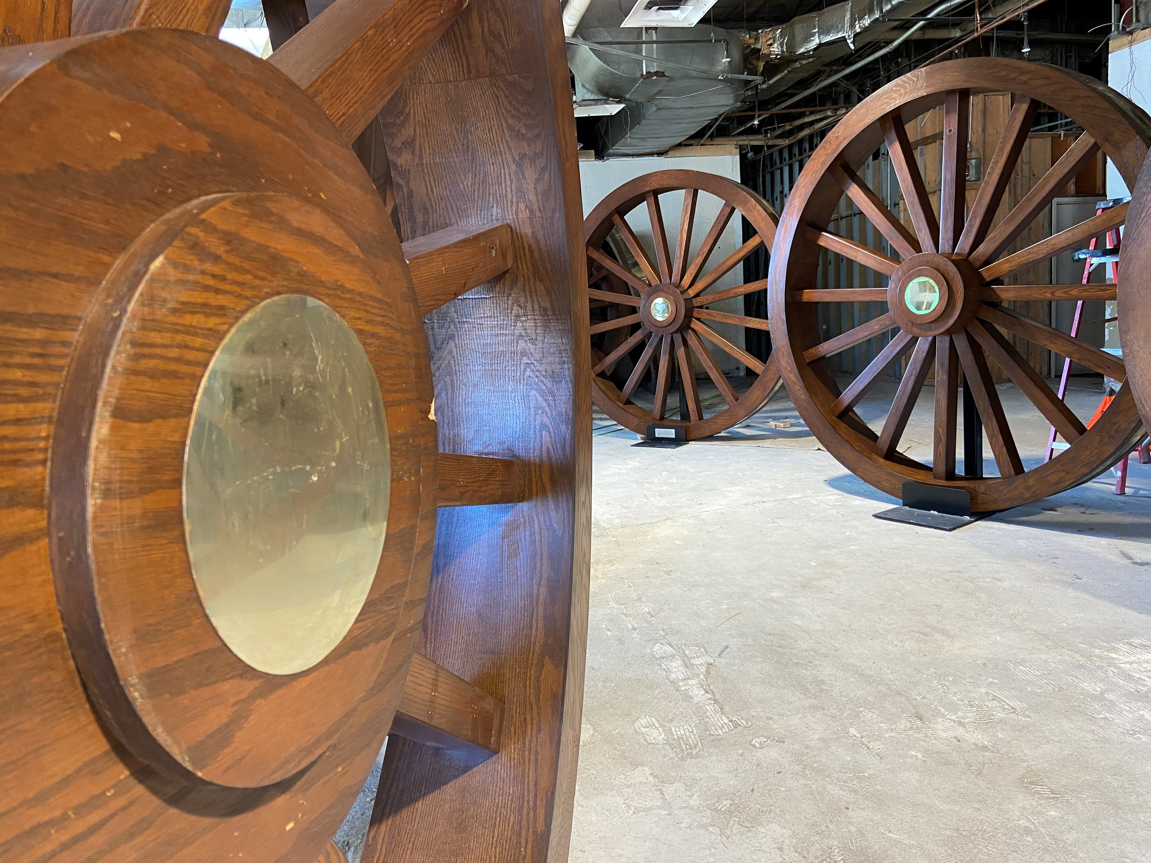 The eight foot wagon wheels weigh over 200 pounds each. But Delaney said it is history worth saving. The relics of the past from the notorious bar and hotel are being sanded and spruced up.