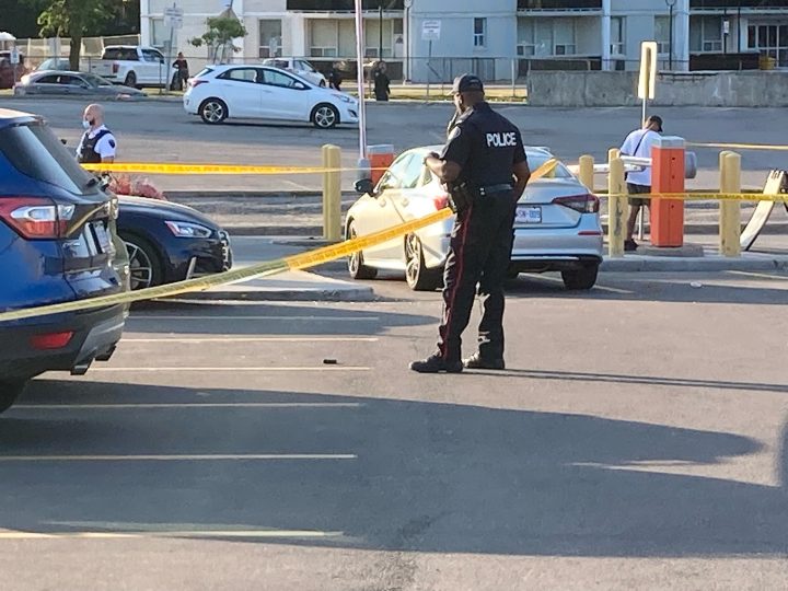 Toronto police said they arrived at the scene on Saturday evening to find two men suffering from gunshot wounds, with injuries that “appear serious.”