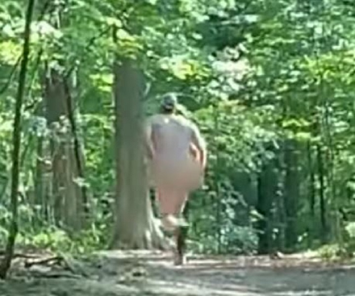Police said a female victim was sitting on a bench along the trail when a male suspect “came out of the forested area naked.”