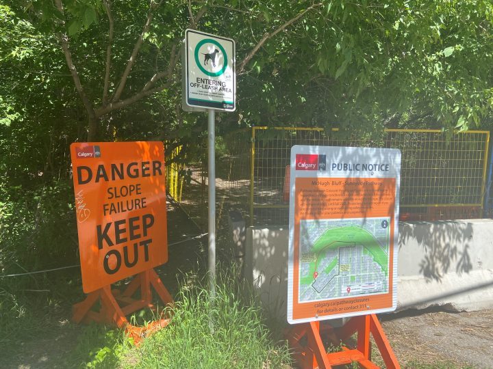 McHugh Bluff is a popular spot for dog walkers and cyclists. It overlooks Calgary’s downtown skyline but now fences block off the path and notices warn against entry.