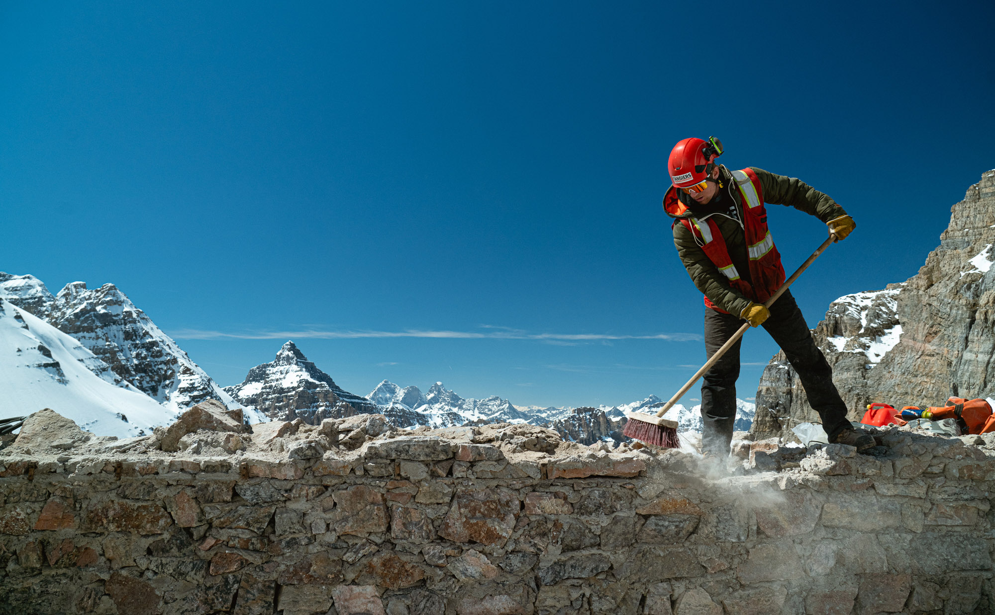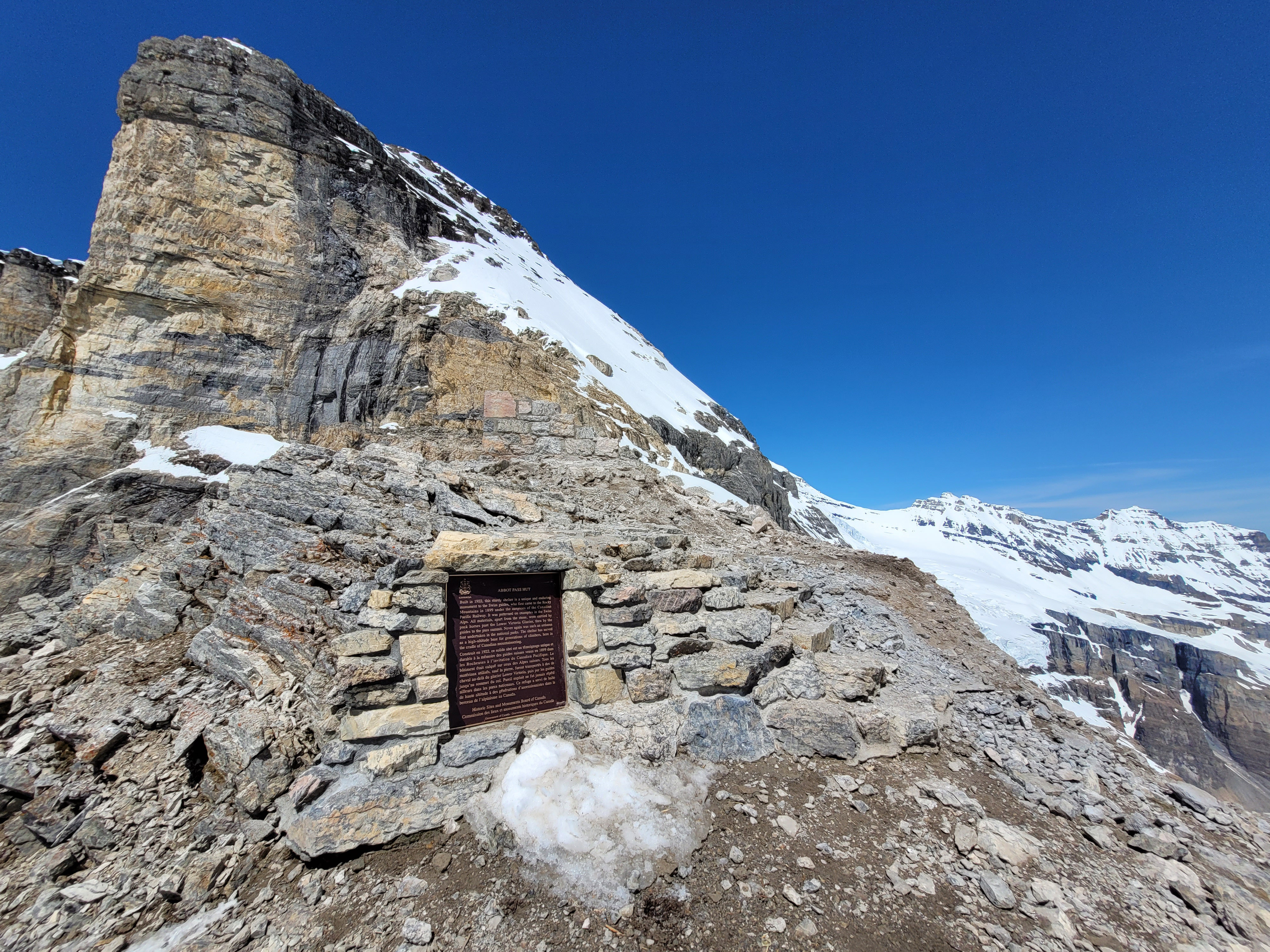 Only a piece of wall, some stone steps and a plaque about the Abbot Pass Refuge Cabin remain at the site that straddles the Continental Divide and the Alberta-British Columbia boundary.