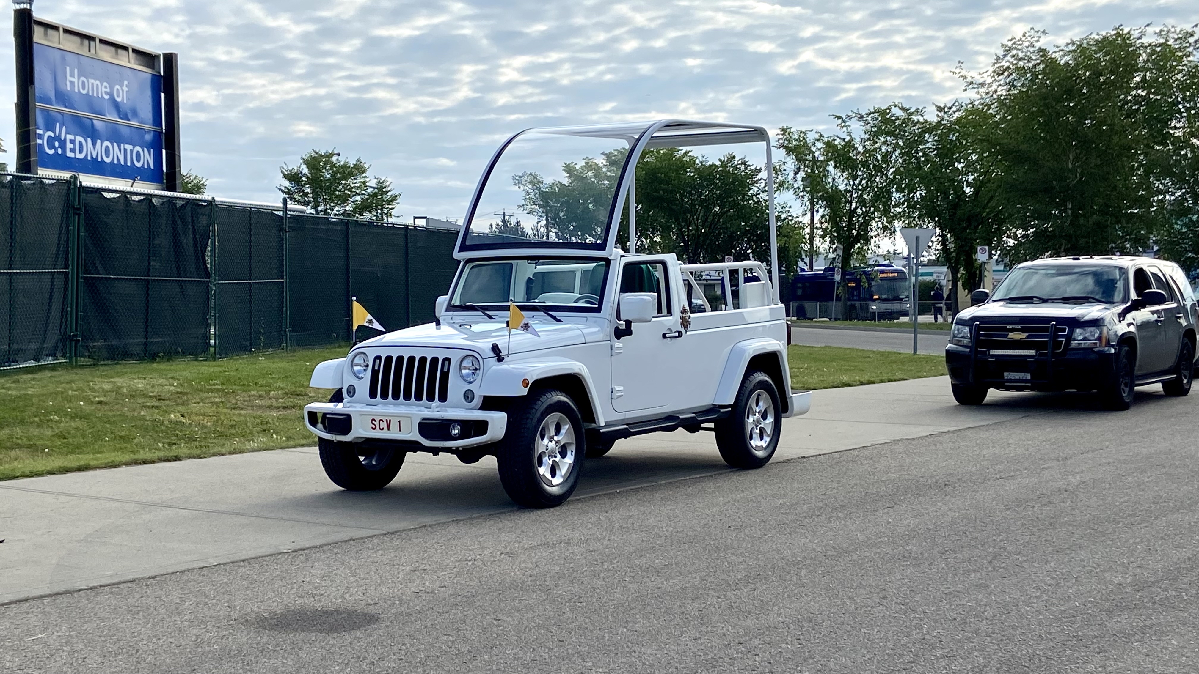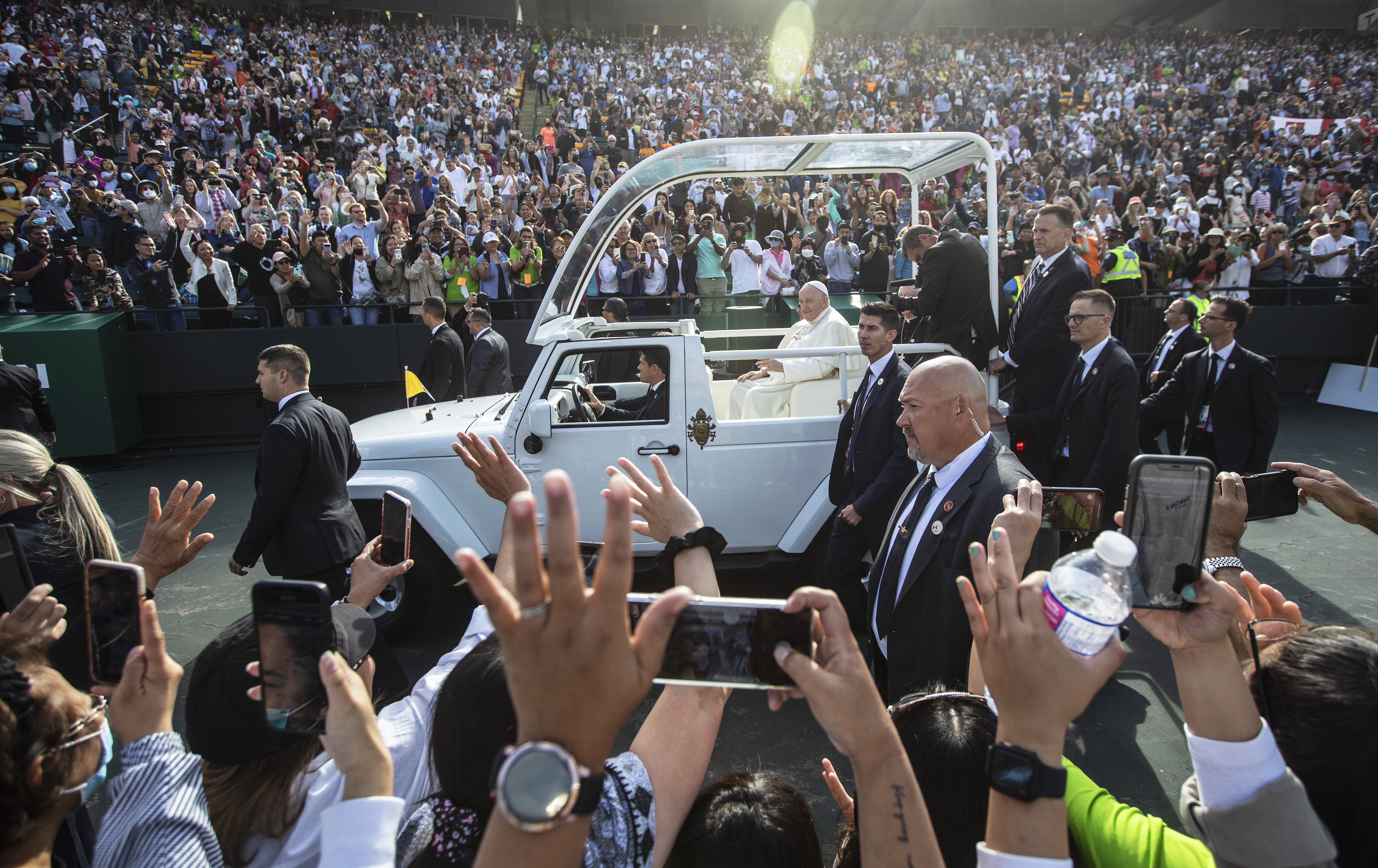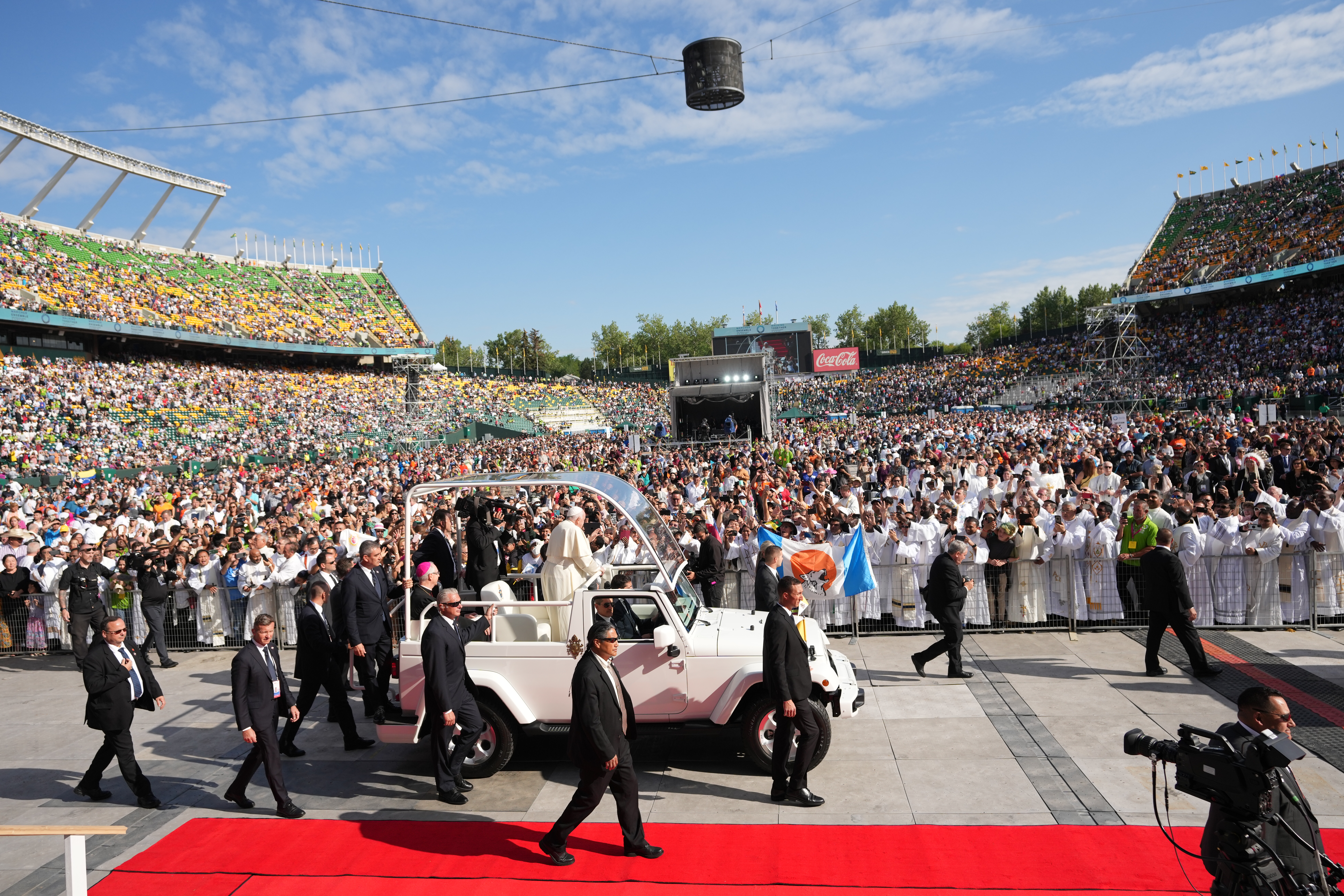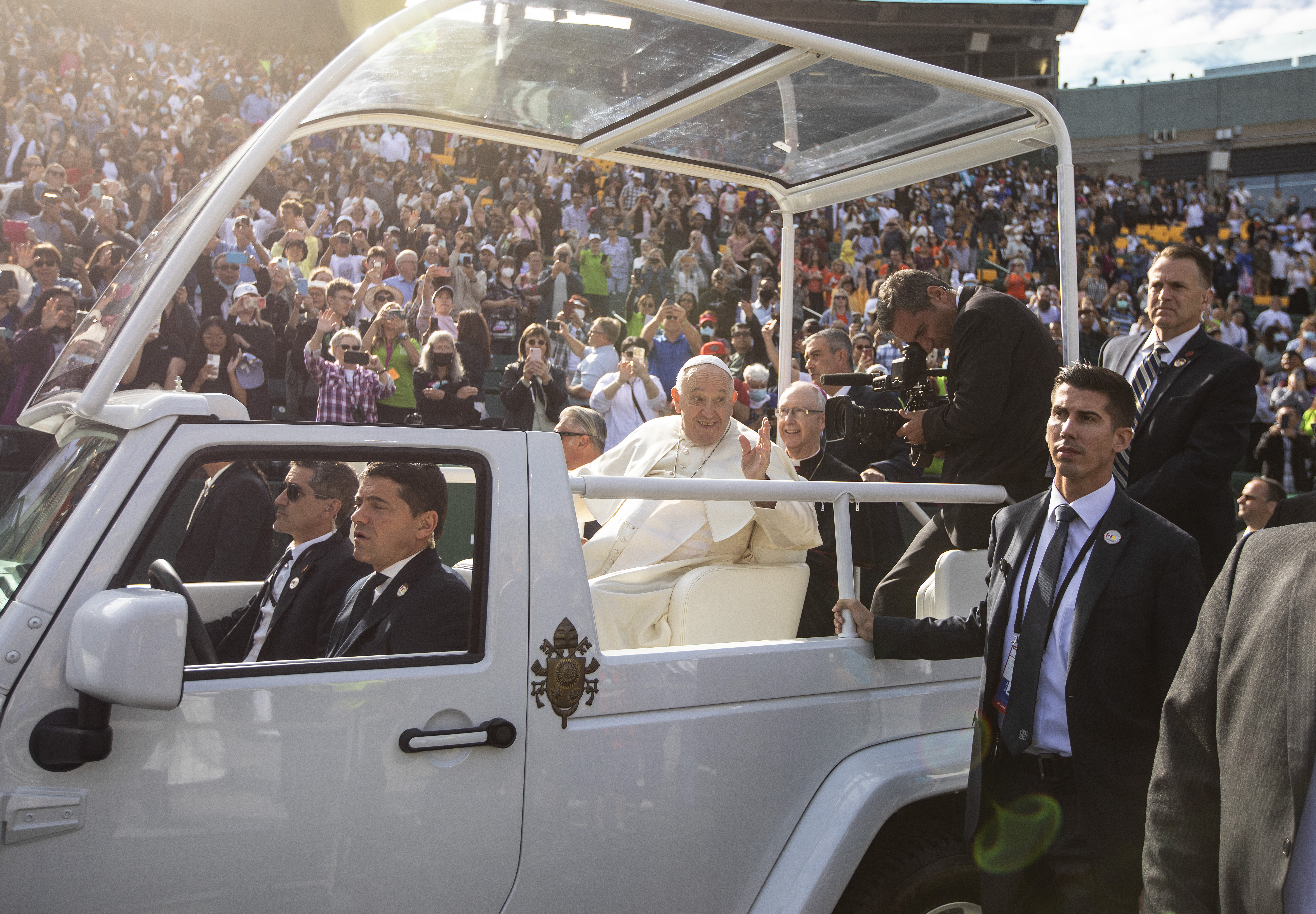 He stood in the popemobile as it slowly made its way around the football field. Cheers came from the stands and an Indigenous drum group played for his arrival.