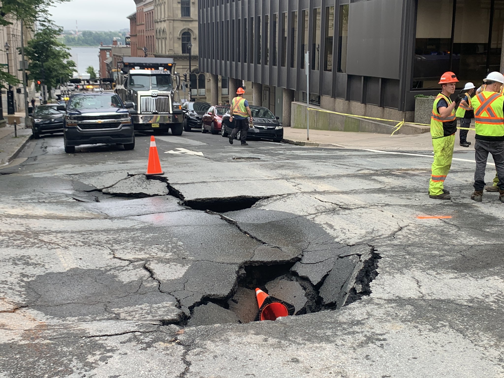 The resulting sinkhole at the corner of Granville and Prince streets has closed down traffic to the area.