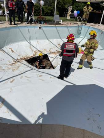 Another unnamed 34-year-old man was also injured when the sinkhole opened, and he was treated by medical officers for minor injuries to his head and limbs. In terrifying video footage of the incident, people in bathing suits can be heard shouting as they watch the pool’s water quickly disappear into the sinkhole.